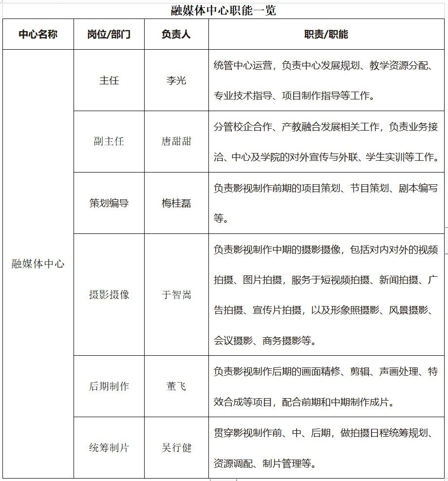 我校融媒体中心的服务群体以艺术与传媒学院的数字媒体艺术、影视摄影与制作、视觉传达专业以及信息学院的软件工程、网络 工程、大数据技术专业学生为主,开展实习实训服务;同时统筹全校宣传工作、盘活校园现有媒体资源,形成全领域、广覆盖的立体式宣传传网, 构建全校一盘棋的“大宣传”格局。