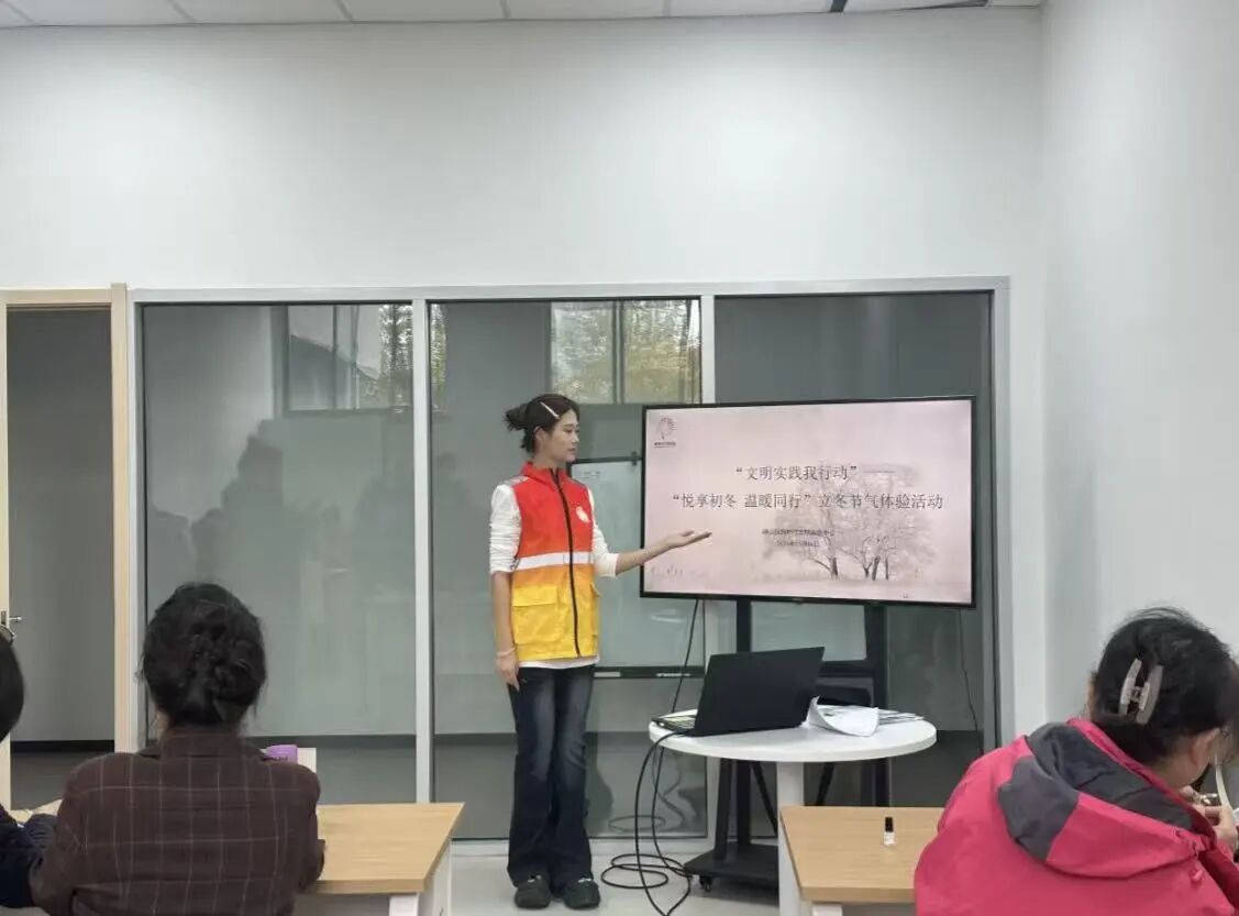 活动伊始,志愿者们带来了精心筹备的立冬主题 PPT 宣讲。为让老年群体轻松理解,志愿者团队结合艺术专业优势,将 PPT 设计得图文并茂、重点突出,用简洁通俗的语言搭配生动的民俗图片、动画短片,从立冬节气的由来、历史渊源、传统习俗及养生文化四个维度展开讲解。
