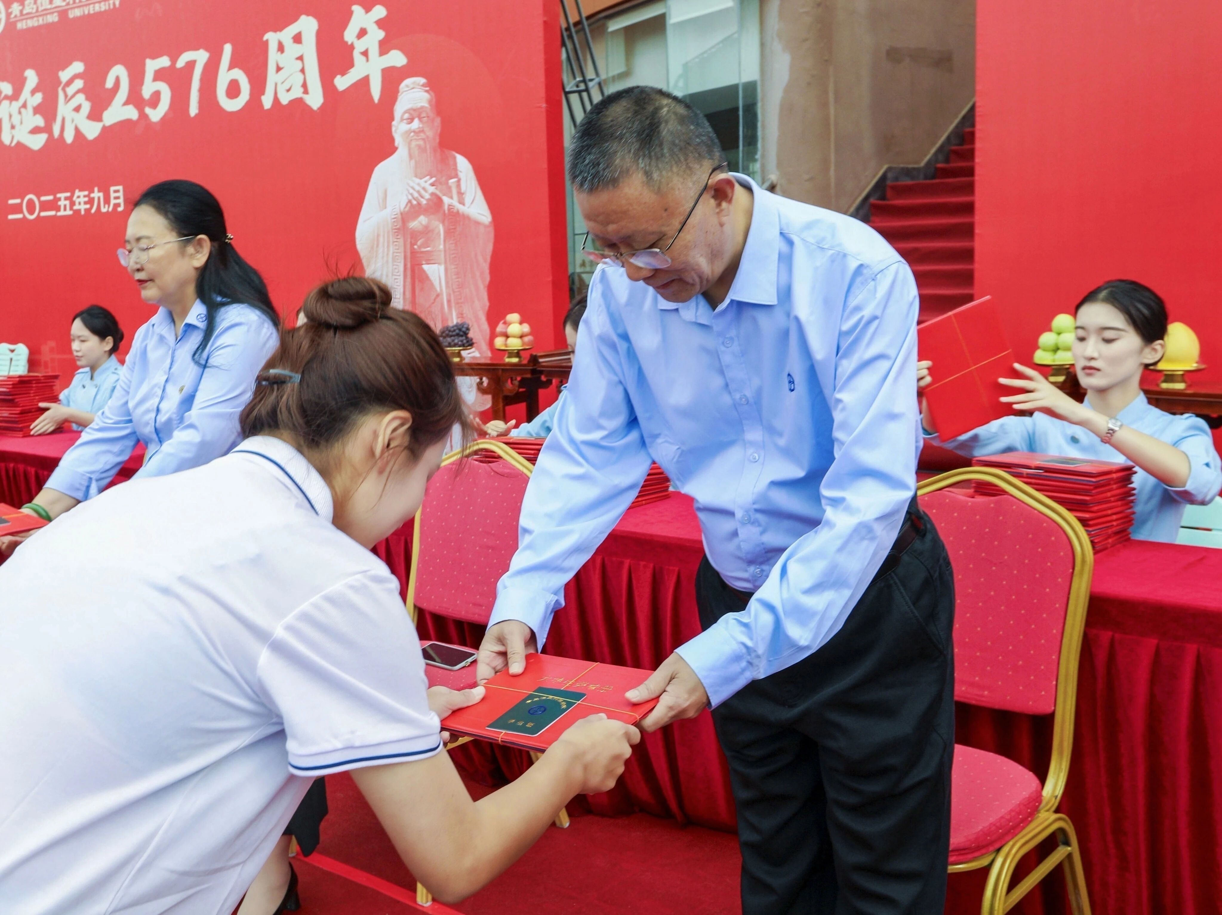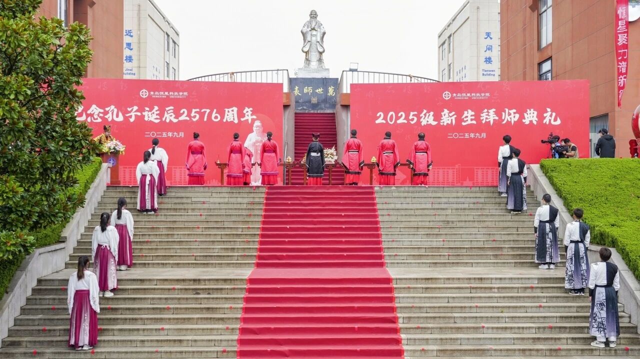 9月28日,在孔子诞辰2576周年之际,青岛恒星科技学院隆重举行了2025级新生祭孔大典暨拜师典礼。艺术与传媒学院2025级1135名新生齐聚中天苑,共同完成了庄重的祭孔拜师仪式。