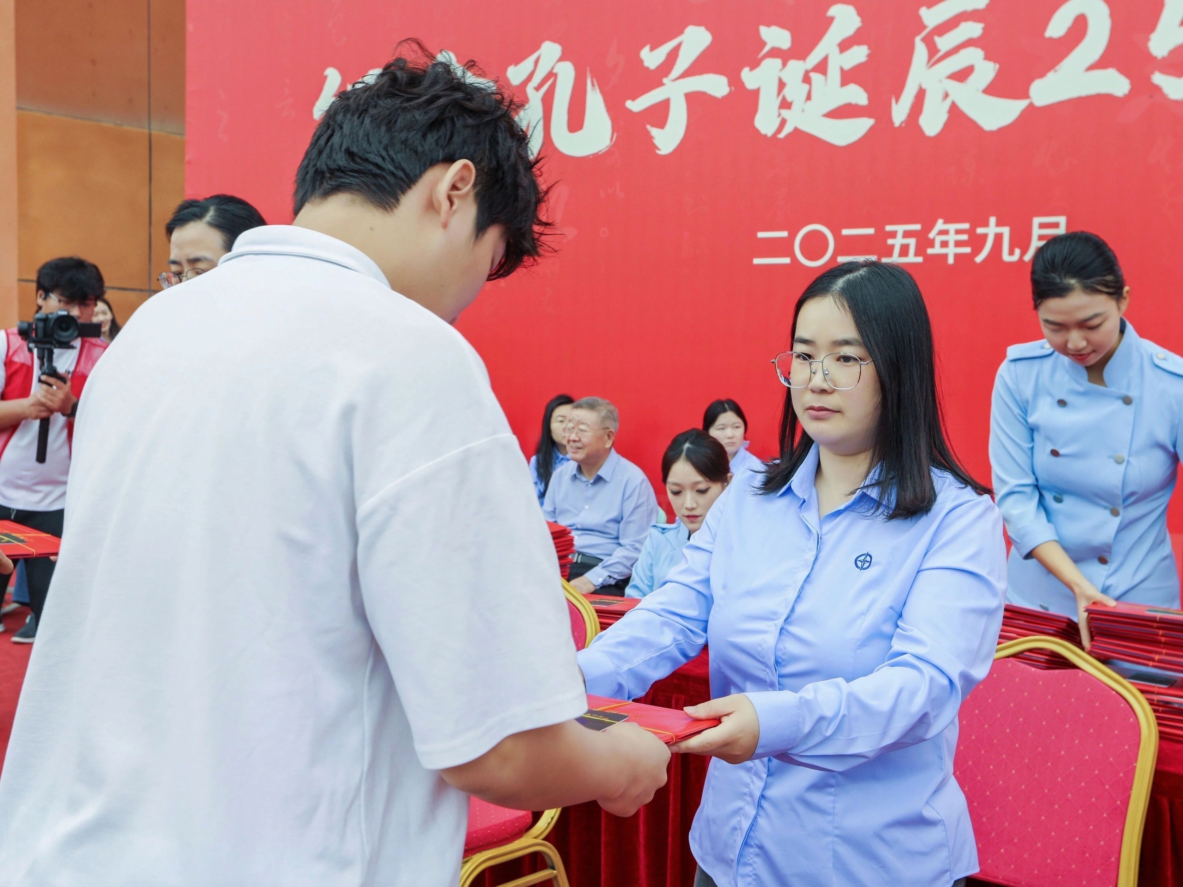 艺术与传媒学院2025级全体新生依次列队登台,向导师行礼,在导师的殷殷嘱托中完成拜师仪式。