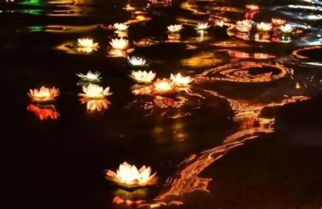 河灯,一般是在底座上放灯盏或蜡烛。处暑前后民间会有庆赞中元的活动,俗称"作七月半"或"中元节",在水中放河灯,任其漂流,悼念逝者,祈保平安。