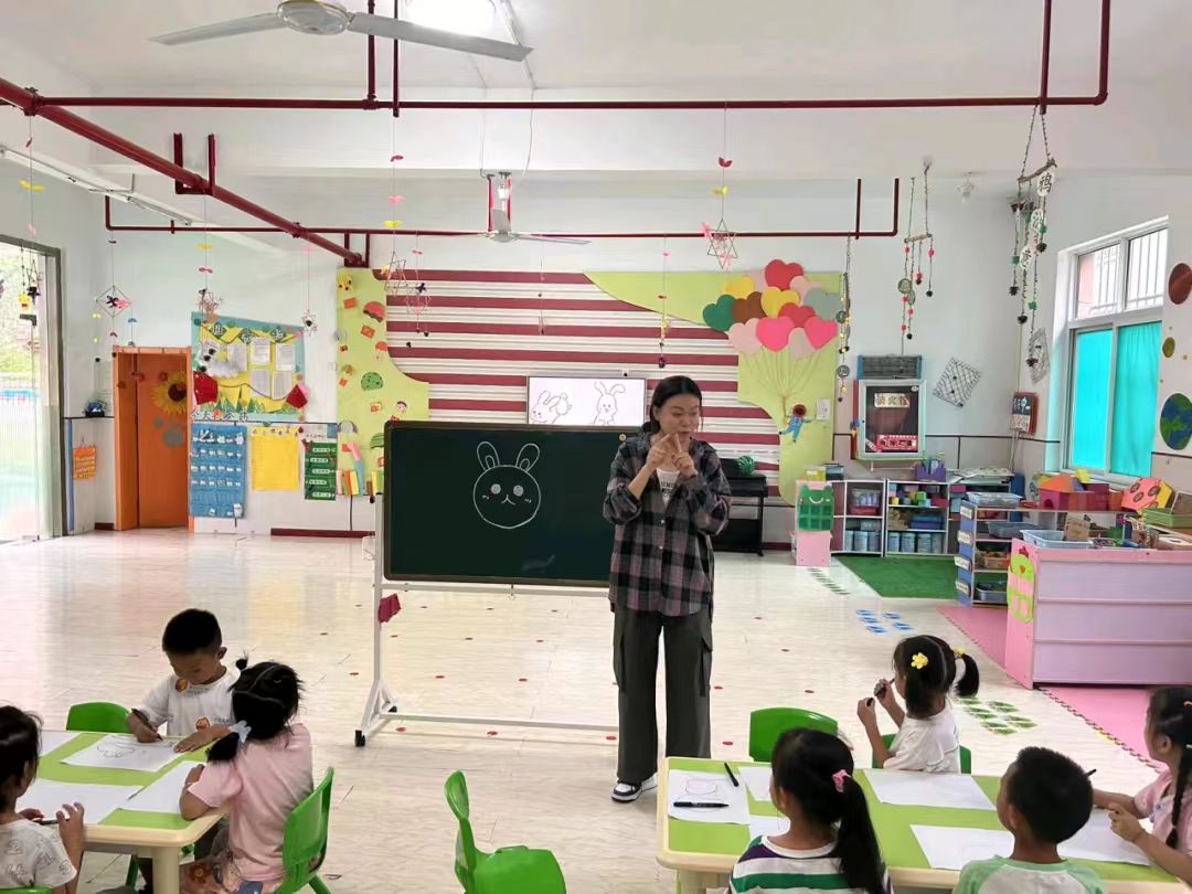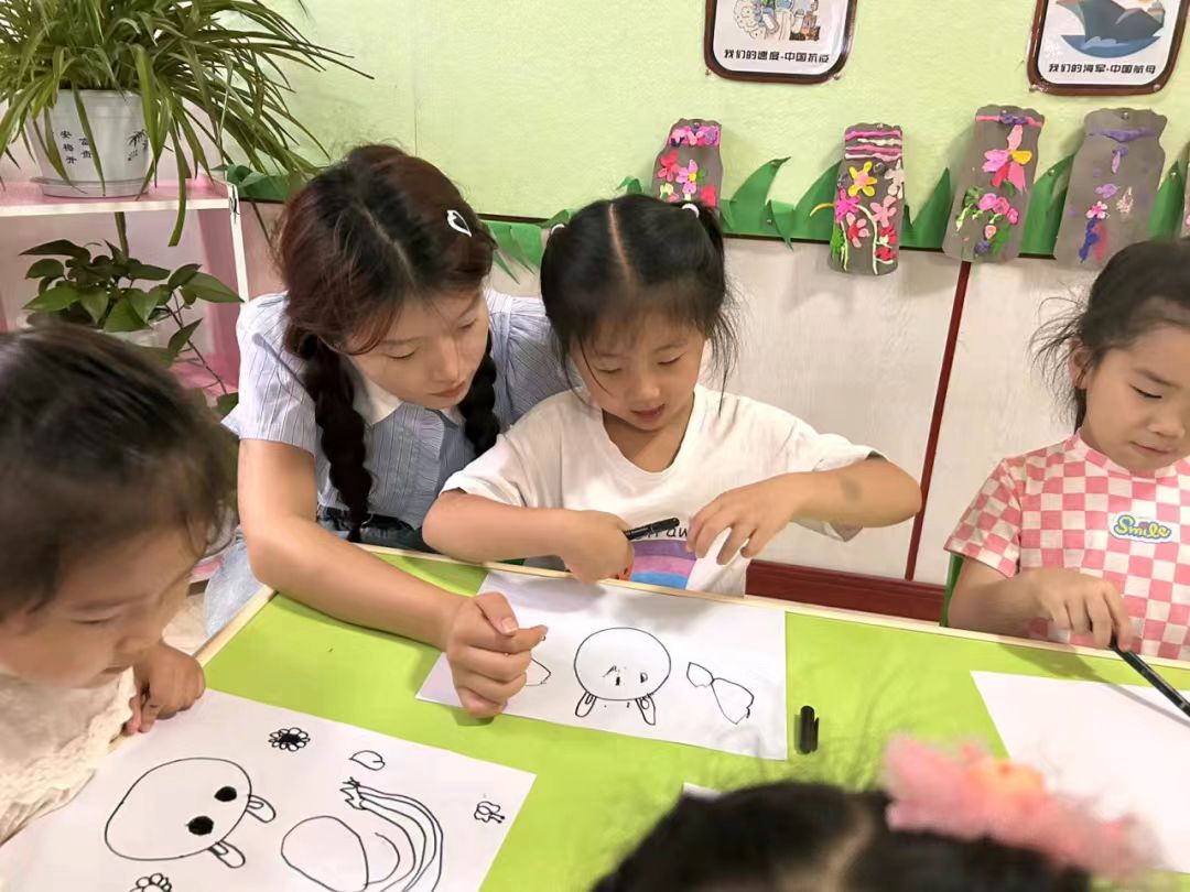 图为恒星学子在社区幼儿园为小朋友上美术课。