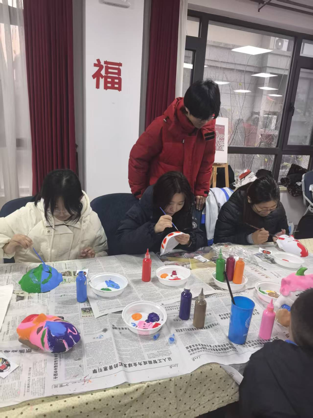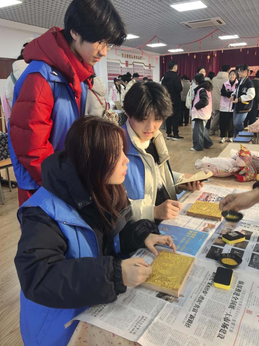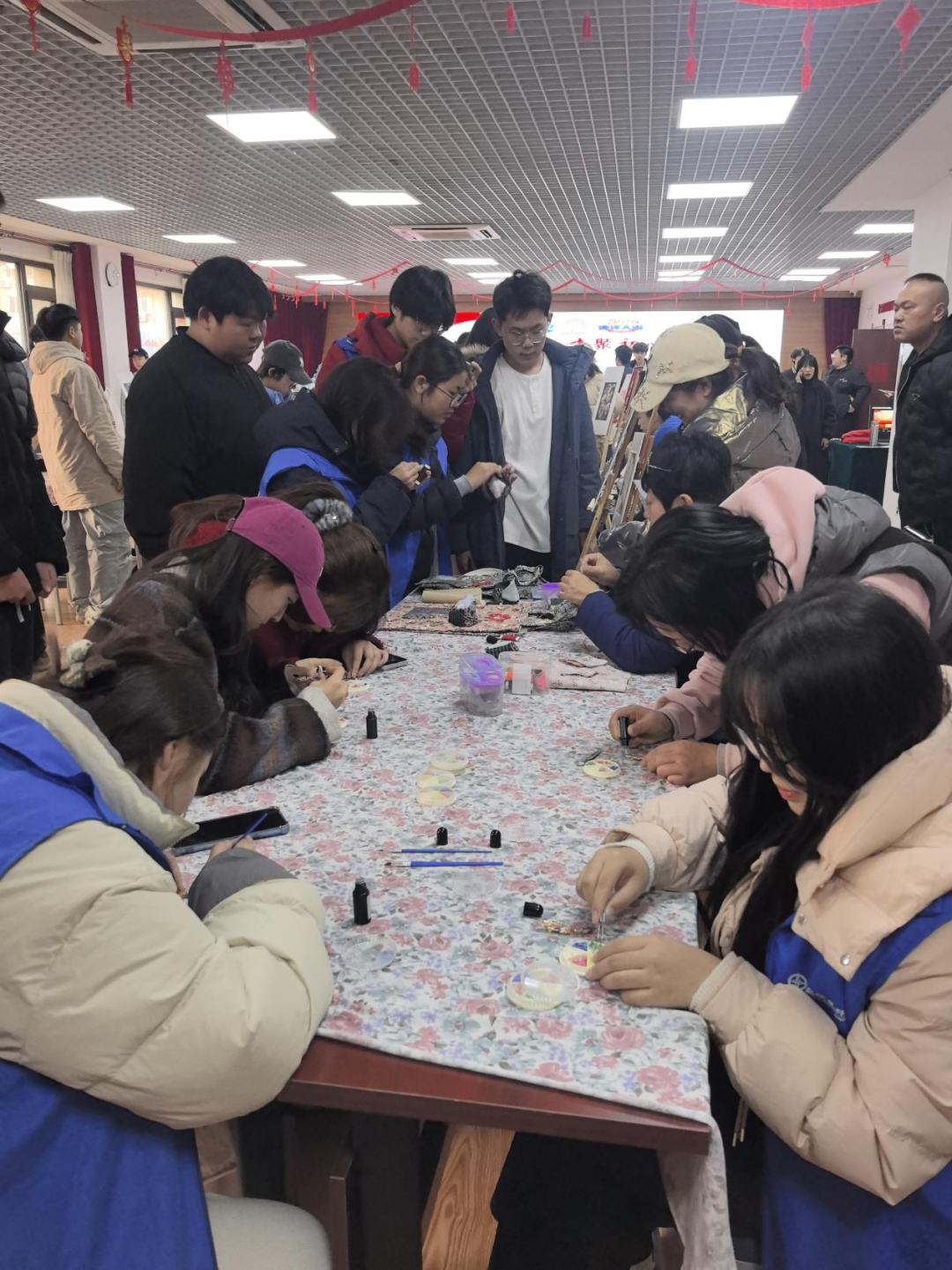 讲座结束后,最受期待的非遗动手实践环节正式开启。志愿者们根据自身兴趣分组,分别投入到各项非遗项目的体验中。在剪纸组,志愿者们手持剪刀,在传承人指导下学习折叠、镂空技巧,原本普通的红纸在指尖流转间,变成了寓意吉祥的窗花、栩栩如生的生肖图案;拓印组的志愿者们小心翼翼地涂抹颜料、铺纸按压,感受着墨色在纸张上晕染开来的奇妙过程,当一幅幅带着古朴韵味的拓印作品完成时,大家难掩喜悦之情;刺绣组的志愿者们穿针引线,从基础的平针绣学起,耐心勾勒图案轮廓,虽然手法略显生疏,但每一针都饱含专注与热情;国画组的志愿者们则发挥专业特长,在宣纸上挥毫泼墨,将今日所见所感融入笔墨之中,创作了多幅兼具传统韵味与青春气息的作品;冷香丸、陶瓷、漆扇组的体验同样精彩,志愿者们在传承人带领下,从原料配比、制坯塑形到上色装饰,一步步完成属于自己的非遗作品,过程中相互协作、互帮互助,遇到难题共同探讨解决,便民服务站内充满了欢声笑语。