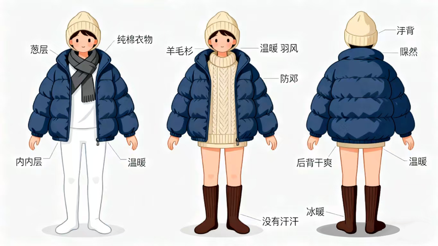穿衣要讲“层次感”,“洋葱式穿衣法”yyds!内层选纯棉、莫代尔等排汗面料,保持皮肤干爽;中层穿羊毛衫、抓绒衣锁住热量;外层搭防风外套或厚羽绒服抵御寒风。头部、颈部、腰腹和脚踝是抗寒薄弱区,帽子、围巾、保暖袜一个都不能少,老人小孩以手脚不凉、后背无汗为标准,别过度包裹。