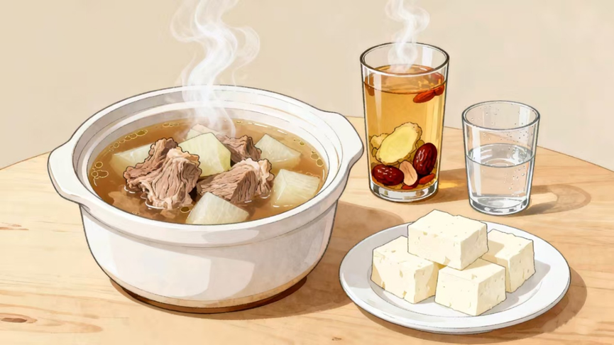 “穿厚不如吃暖”,饮食温补最养人。羊肉炖萝卜、生姜红枣茶都是经典暖身选择,素食者可多吃豆腐补充维生素B2,减少热量流失。记得多喝40-50℃的温水,避免刺激食道,少吃生冷食物,保护肠胃不受寒。