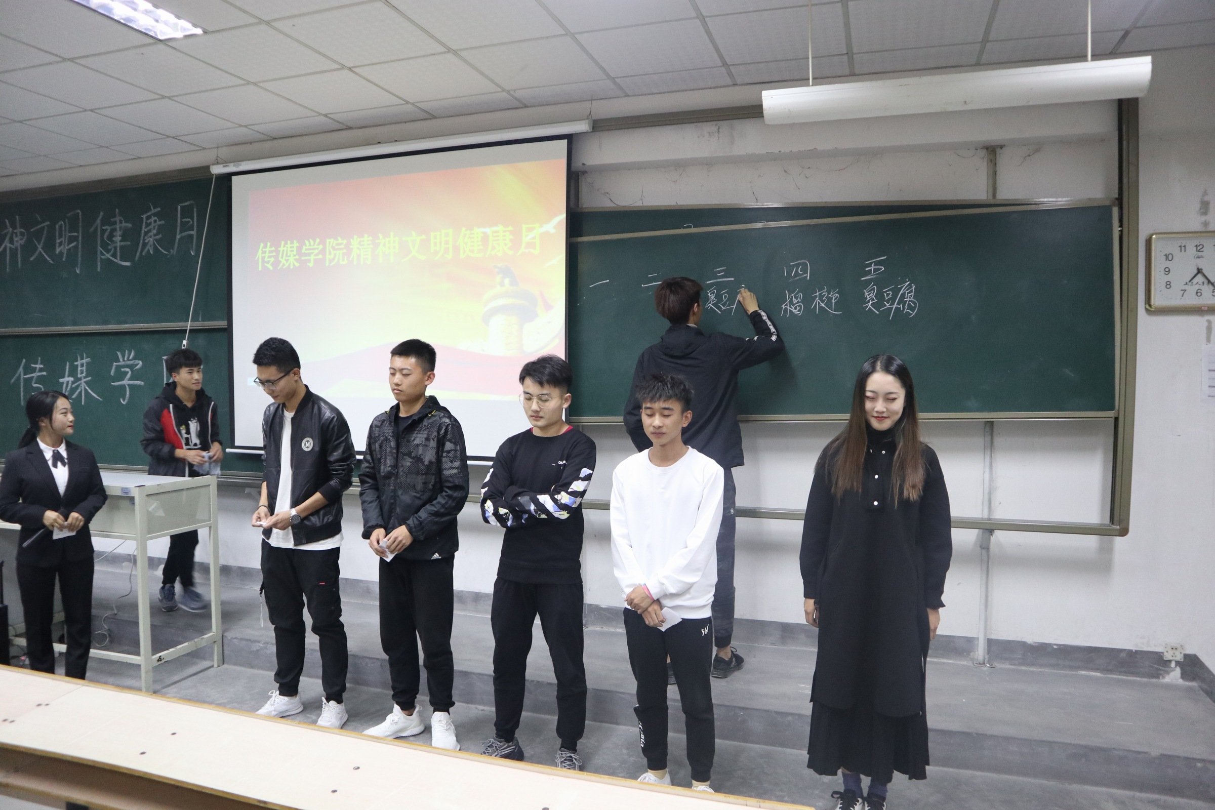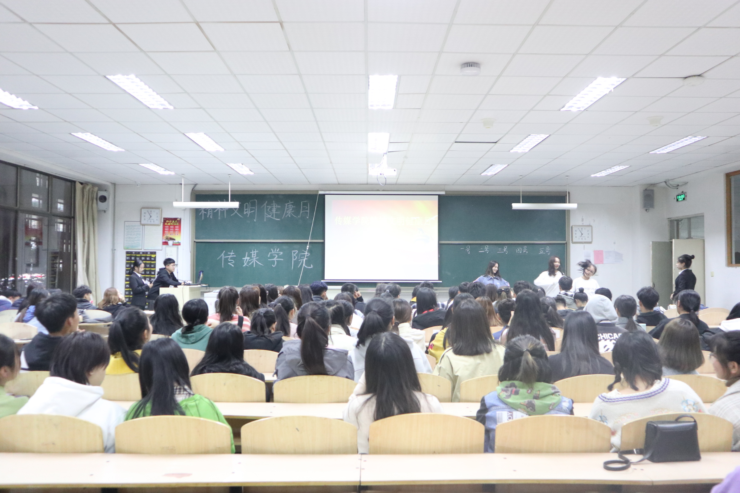 精神健康文明是这个月份的主题,我们积极筹备活动让同学感受到学校大家庭的温暖,让每一个人在学习生活之后有环节疲惫的活动,让同学们都可以在接下来繁重的学习生活中可以焕然一新,让领导看出咱们传媒学院的精神文明健的面貌。