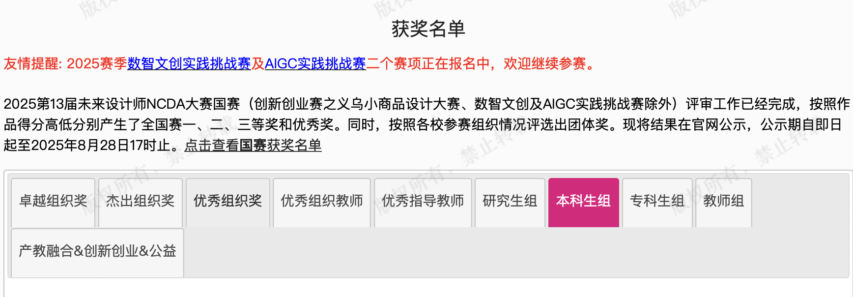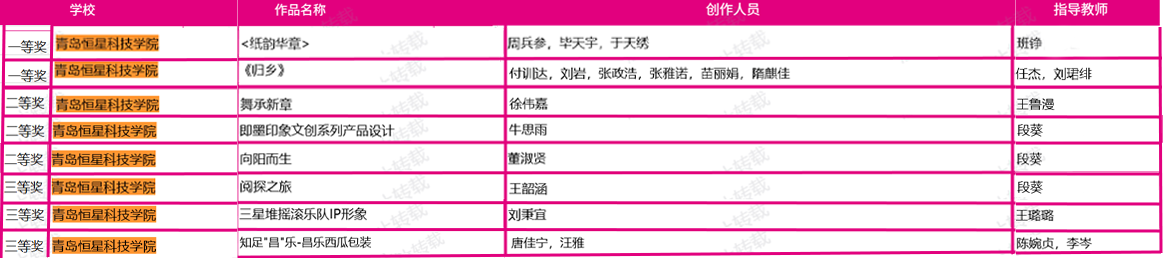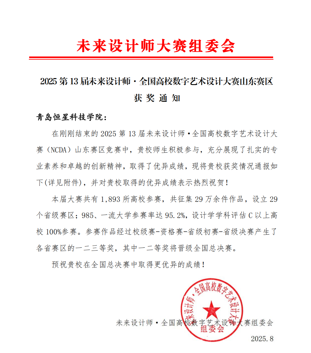 近日,第13届未来设计师·全国高校数字艺术设计大赛(NCDA)全国总决赛获奖名单新鲜出炉,我院师生表现优异,共斩获8项国家级奖项,包括一等奖2项、二等奖3项、三等奖3项。此外,青岛恒星科技学院获 “优秀组织单位”。