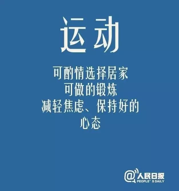 建议说:“居家期间每天应该保持一定的运动量,可以选择原地大幅度摆臂慢跑、太极拳、八段锦等适量柔和运动方式,每天运动量以积累一到两个小时左右为宜。睡前也可以利用床上或瑜伽垫,做简单瑜伽、脊柱平衡操等脊柱和四肢牵拉练习,以微汗为度。”运动之外,也建议注意饮食均衡清淡,充足补水,多喝清茶。规律作息,保证充足睡眠,不熬夜。保证心情平静不要急躁。”
