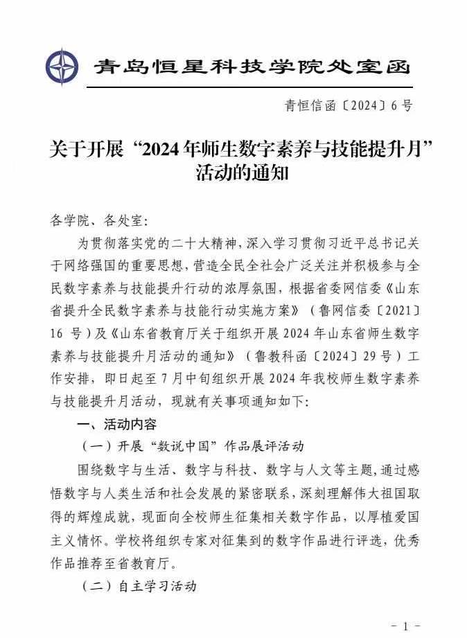 为贯彻落实党的二十大精神,深入学习贯彻习近平总书记关于网络强国的重要思想,营造全民全社会广泛关注并积极参与全民数字素养与技能提升行动的浓厚氛围。根据《山东省提升全民数字素养与技能行动实施方案》的要求,青岛恒星科技学院艺术与传媒学院开展了2024年师生数字素养与技能提升活动月系列学习活动。