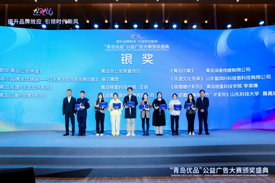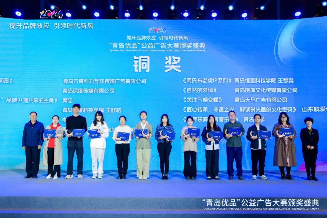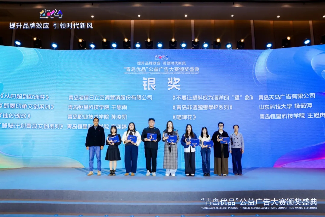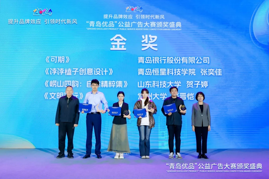 11月7日,由青岛市市场监管局联合市委宣传部、市委网信办、市教育局、市城市管理局、市文化和旅游局共同举办的2024年度“青岛优品”公益广告大赛颁奖典礼在青岛海天金融中心酒店举行,我院师生受邀参加,并斩获金奖1项,银奖5项、铜奖3项、优秀奖3项,我校获得优秀组织单位奖。