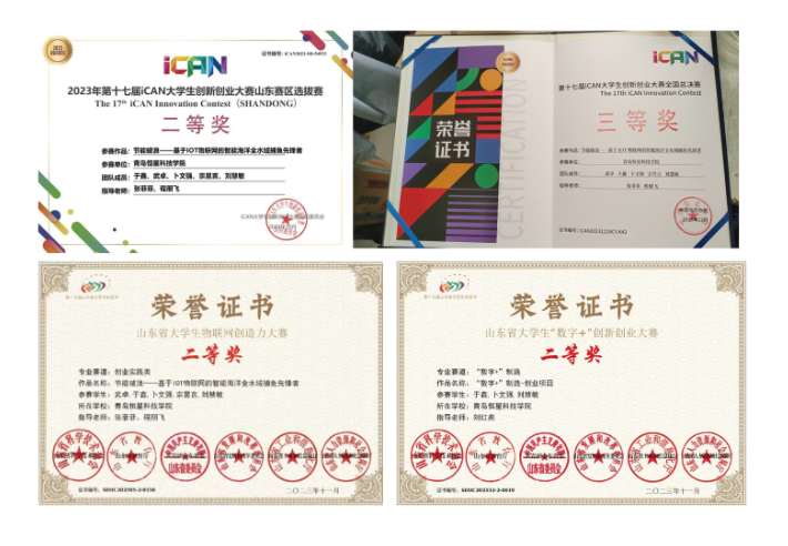 在创新创业比赛的天地里,她更是一位果敢的践行者。凭借明晰的职业规划与笃定的职业信念,在创新创业的赛场上,“节能破浪--基于IOT物联网的智能海洋全水域捕鱼先锋者”项目无疑是闪耀的存在。凭借对物联网技术的深度钻研与创新应用,该项目一路过关斩将,不仅在2023年第十七届iCAN大学生创新创业大赛山东赛区选拔赛中荣获二等奖,更在全国总决赛中摘得国赛三等奖。同时,项目还在2023届山东省大学生物联网创造力大赛、山东省大学生“数字+”创新创业大赛中均斩获二等奖。这些荣誉既是对项目创新性与实用性的高度认可,也彰显了团队在智能渔业领域探索实践的卓越成果。