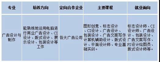 1、培养目标:注重广告设计制作知识的培养,强调理论联系实际,以技能训练为核心,以实践实训为重点,突出学生适应市场需要的能力。培养既懂得电脑技术,又具备现代艺术设计观念,既有创新思维能力和艺术设计能力,又能熟练地运用电脑进行商业广告设计、CI设计、版式设计、展示设计、包装设计等的高素质技能型专门人才。