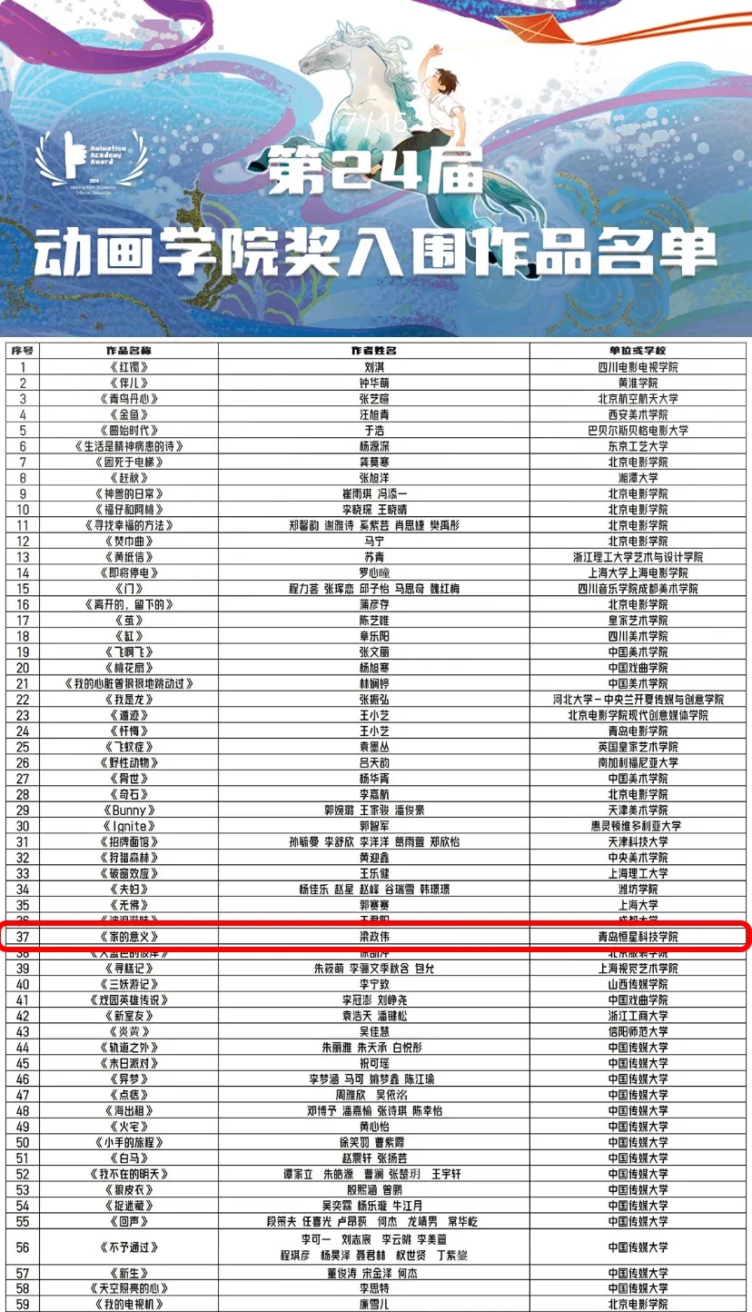 近日,备受瞩目的第24届北京电影学院动画学院奖入围名单正式揭晓,我院凭借数字媒体艺术专业梁政伟的作品《家的意义》,成功入围。在188部入围作品中高居第37位,与包括中国传媒大学、北京电影学院、中央美术学院等在内的众多国内外知名顶尖学府同台竞技,彰显了我院学子卓越的创意与制作水平。