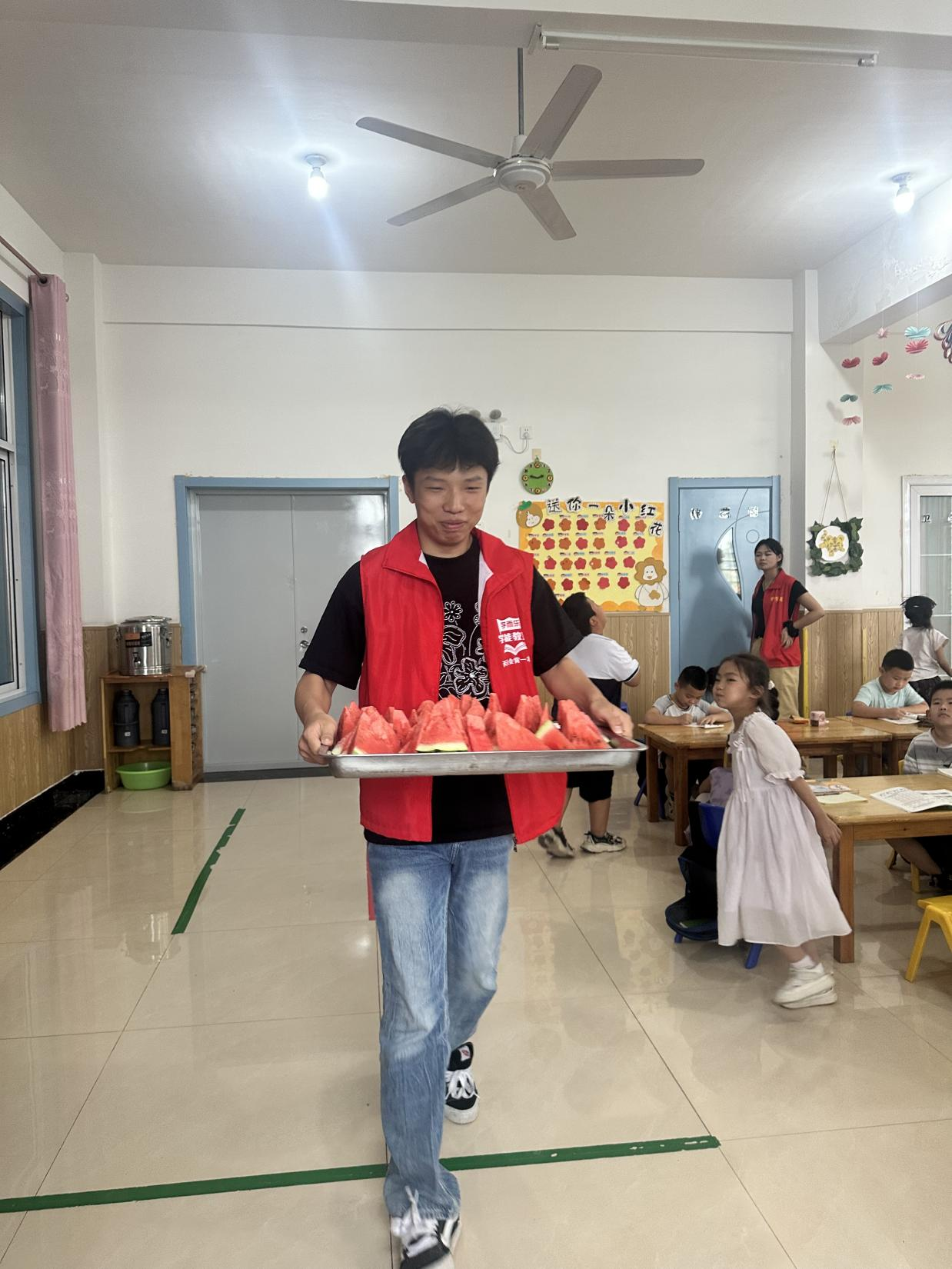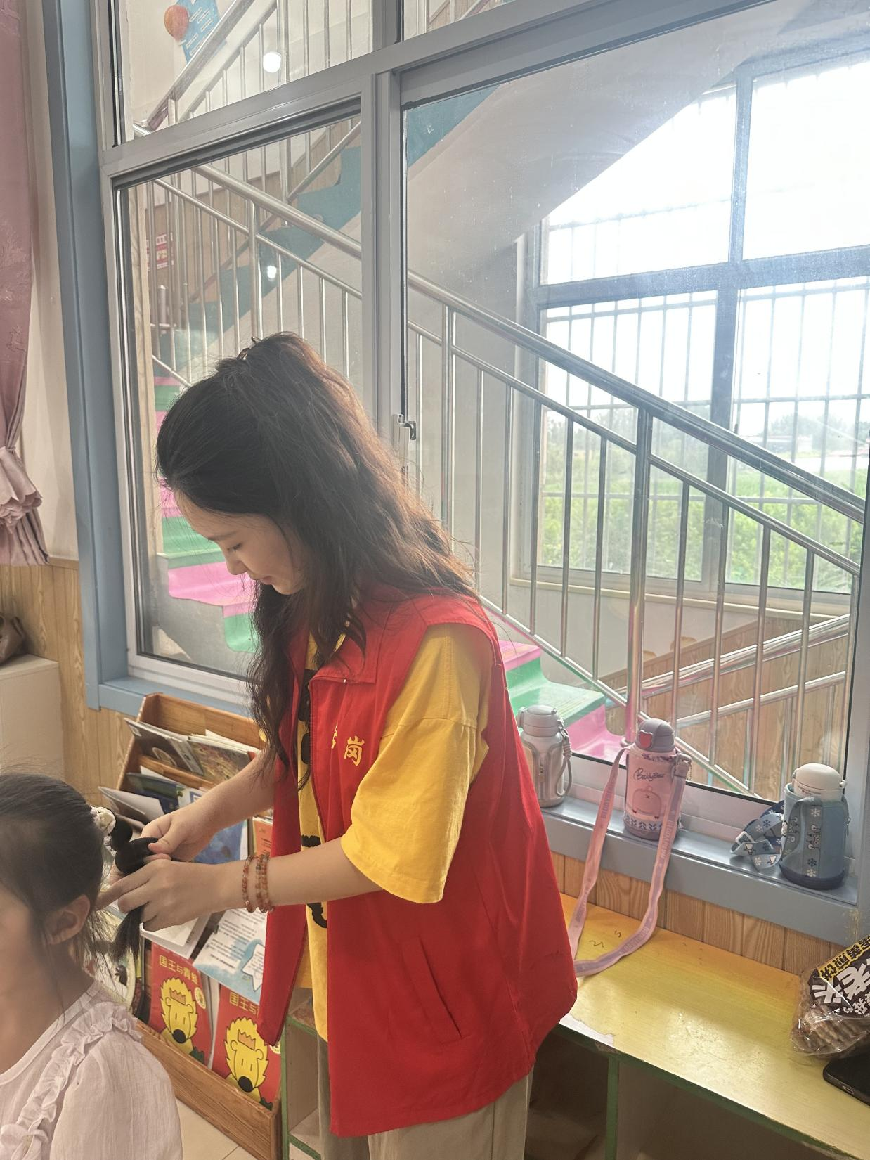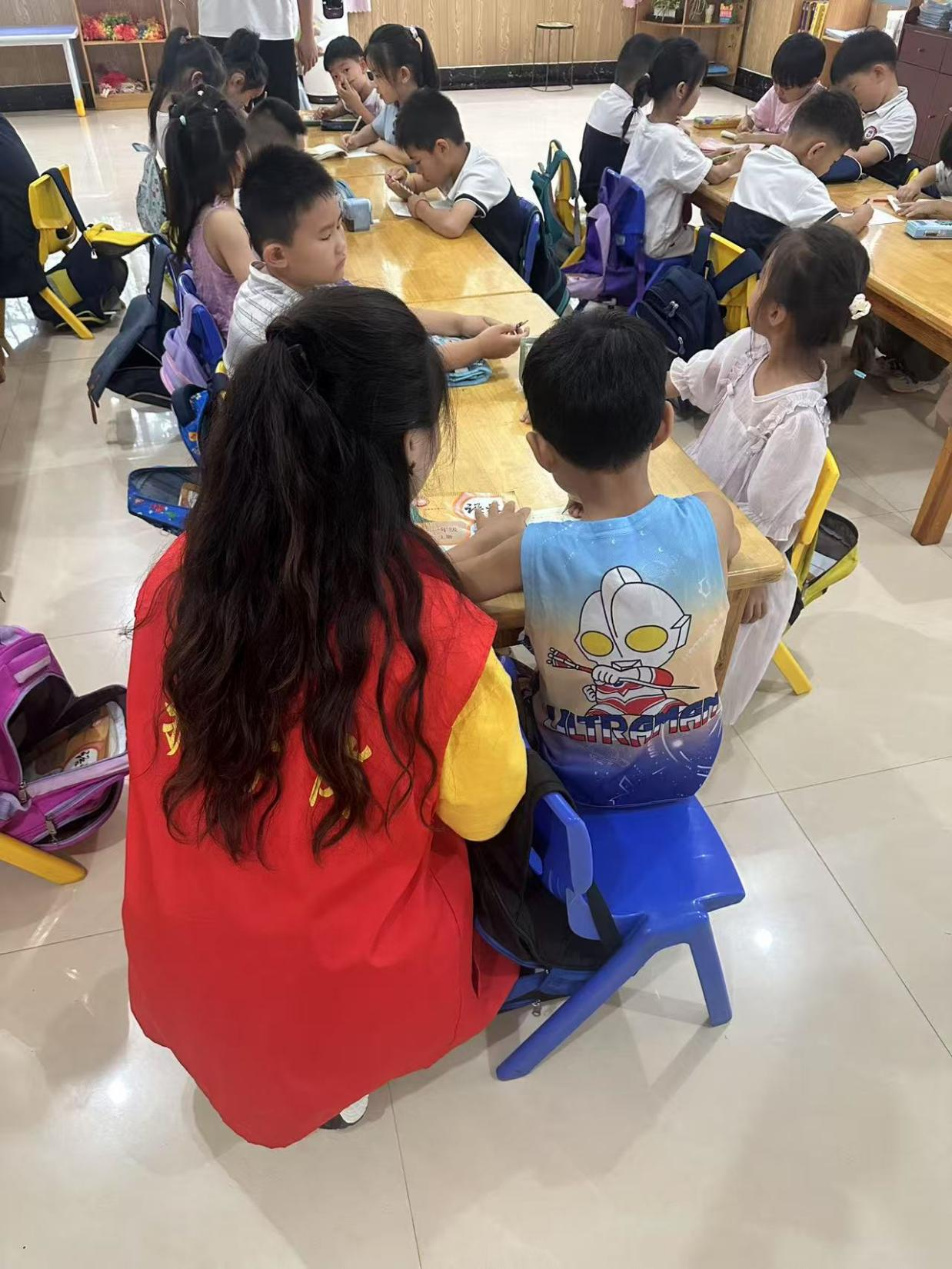 除了课堂上的教学,队员们的陪伴延伸到了孩子们在园的每一个片段。晨间活动时,队员们会和孩子们一起玩“老鹰捉小鸡”,当“鸡妈妈”张开双臂保护“小鸡”时,孩子们的笑声像银铃一样洒满操场;午休前的“绘本时光”,队员们会轻轻抱着睡不着的孩子,在他们耳边讲温柔的小故事,直到孩子闭上眼;加餐时,会细心地帮小班孩子剥鸡蛋壳,听他们叽叽喳喳地分享家里的趣事。