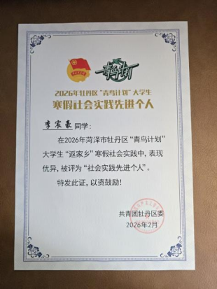 这是一次意义非凡的历练,他走出校园、扎根家乡,在党建岗位上领悟初心使命,在基层实践中增长本领才干。这段经历不仅提升了他的组织协调能力与责任意识,更让他对家乡的发展建设有了更强烈的归属感与使命感。李宸豪用实干诠释青春担当,以行动践行青年使命,被共青团牡丹区委评为“2026年牡丹区‘青鸟计划’大学生寒假社会实践先进个人”,展现了当代大学生心系桑梓、勇于奉献的良好风貌