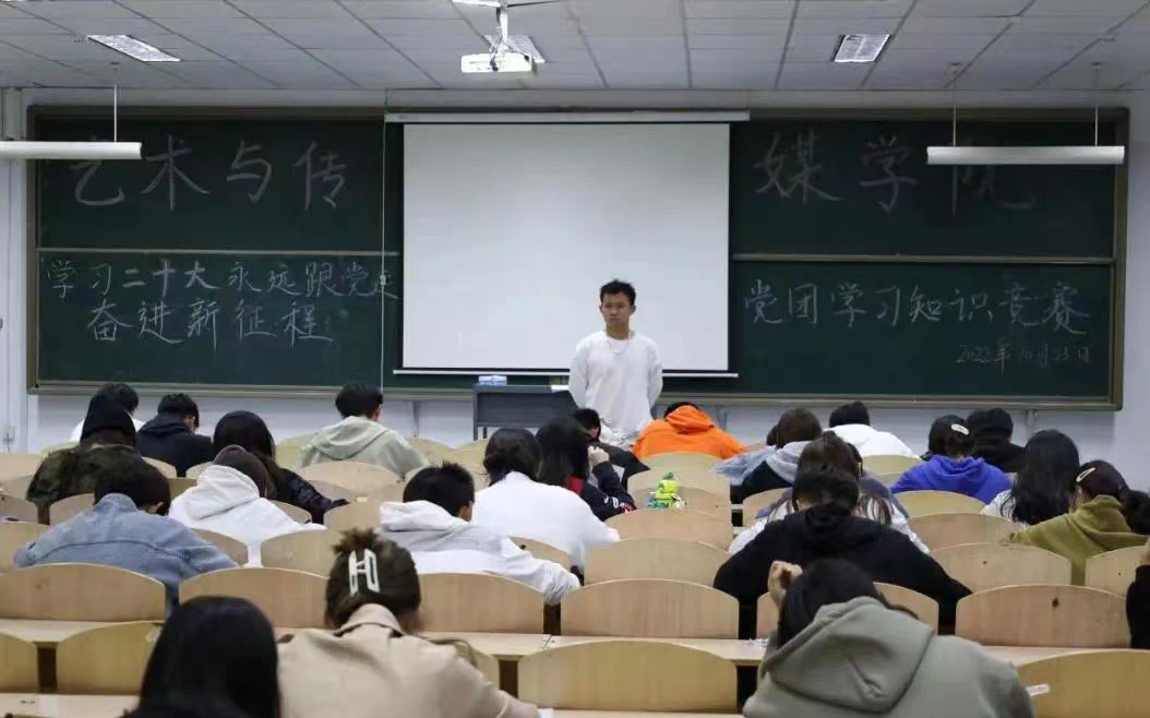 为庆祝党的二十大胜利召开,深入贯彻落实习近平重要讲话精神,2022年10月24日21:30,青岛恒星科技学院艺术与传媒学院在A3-208举办以“学习二十大,永远跟党走,奋进新征程”为主题的党团学习专题知识竞赛;旨在提高党团员的主观能动性,提高青年学生的思想意识和对党的认识,倡导青年学生能够坚定自己的理想和信念,养成艰苦奋斗、热爱学习的优秀品质,加强大学生思想政治教育。