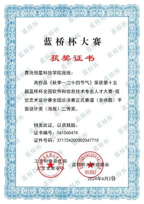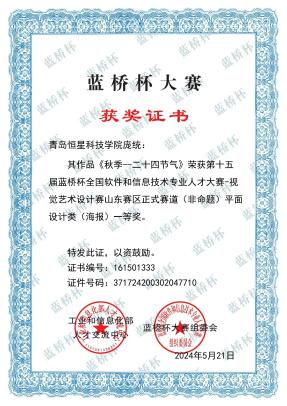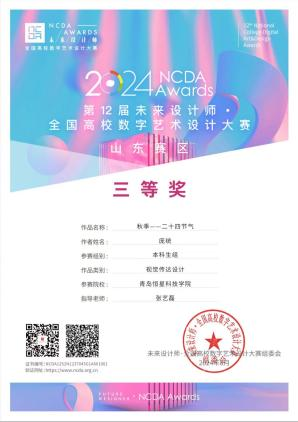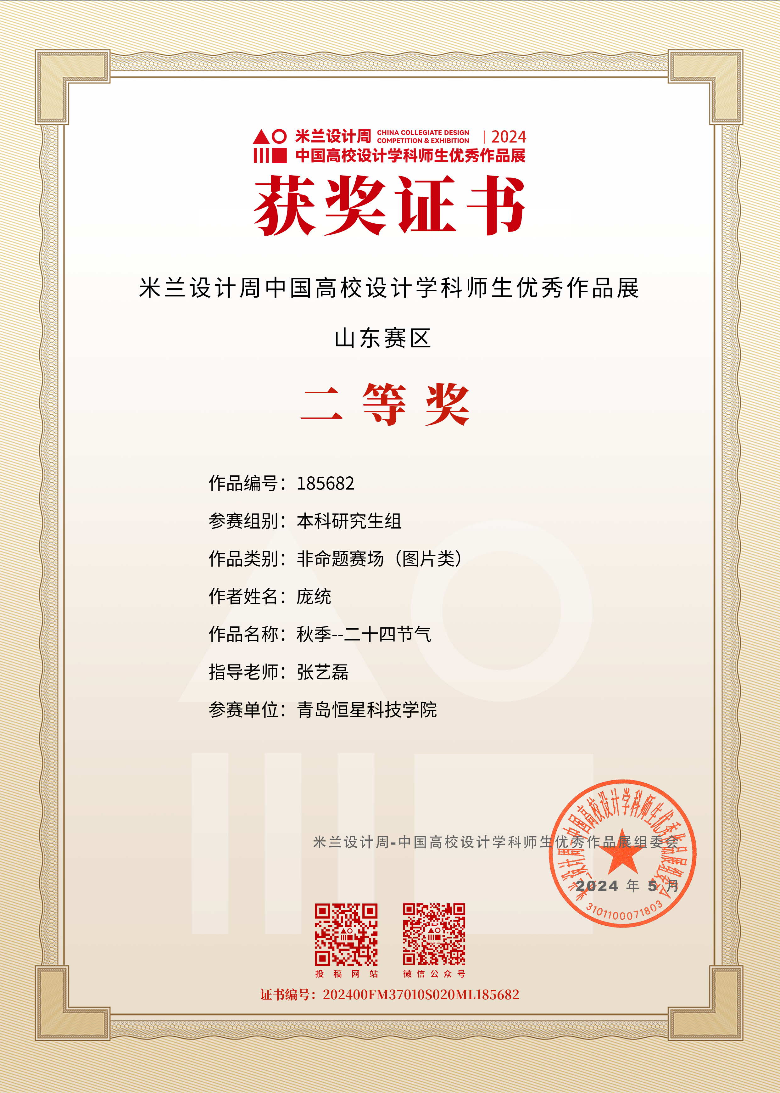 自入学以来,庞统同学的专业成绩稳居同专业同年级前 10%,并且他还积极参加各类设计艺术类大赛,在米兰设计周、蓝桥杯、2024大学生广告艺术大赛、未来设计师设计大赛等众多赛事,荣获国家级3项,省级5项,校级2项。先后获得“米兰设计周-中国高校设计学科师生优秀作品展全国决赛三等奖、“第十五届蓝桥杯全国软件和信息技术专业人才大赛全国总决赛正式赛道二等奖”、“2024第16届全国大学生广告艺术大赛山东赛区三等奖”等众多奖项。