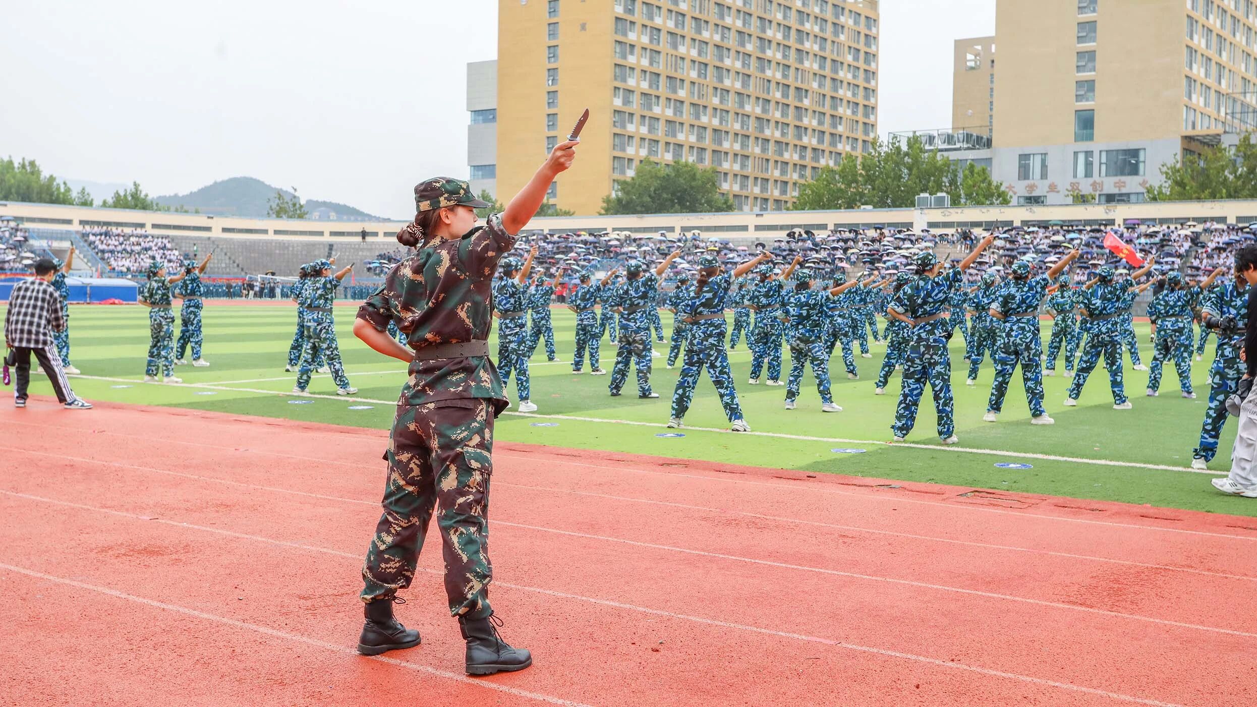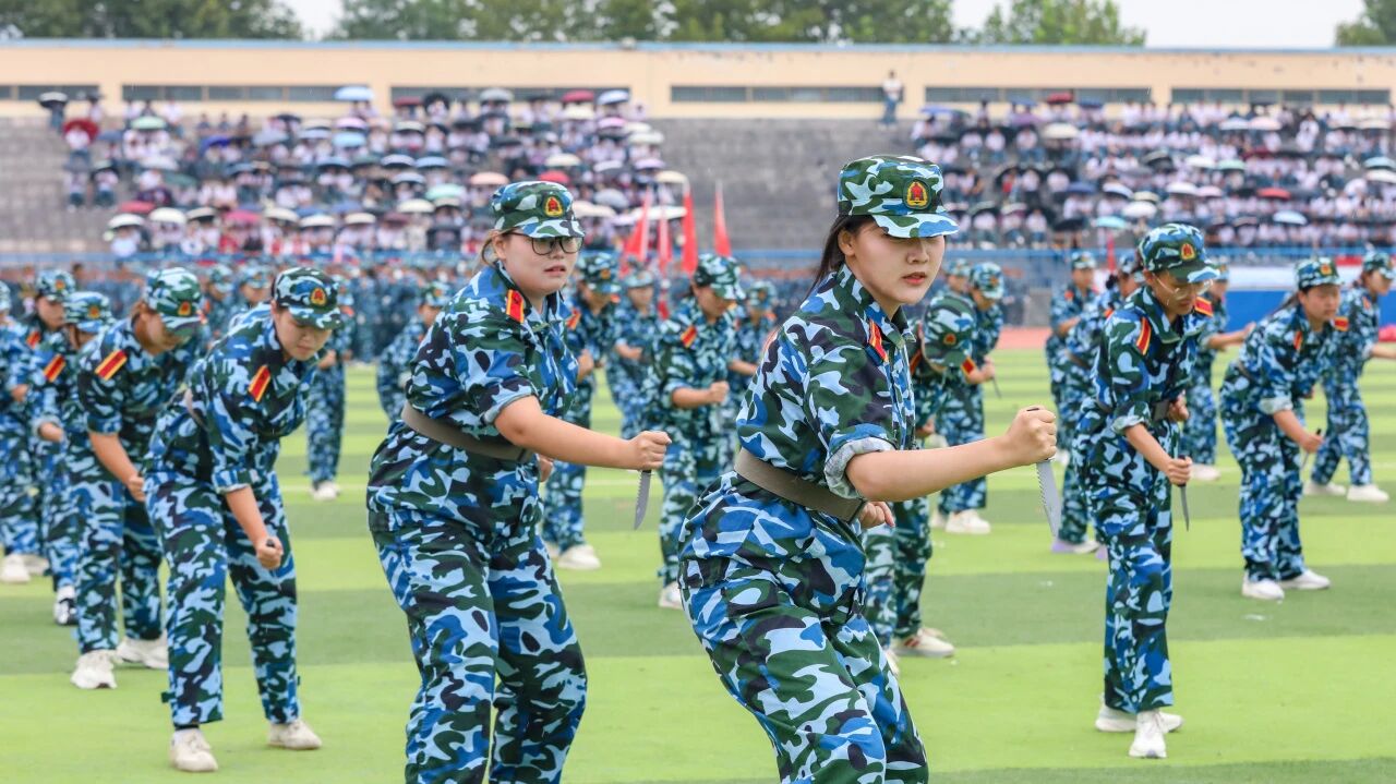 在军事训练成果展示环节,我院军训营女生带了军事科目表演——匕首操。她们口号嘹亮、动作精准、杀声震天,手持“匕首”的每一次劈、刺、挡都刚劲有力,展现出当代女大学生的飒爽英姿与不凡气势。这不仅是军事技能的锤炼,更是力与美的交响,充分展现艺传学子文武兼修、全面发展的昂扬风采。