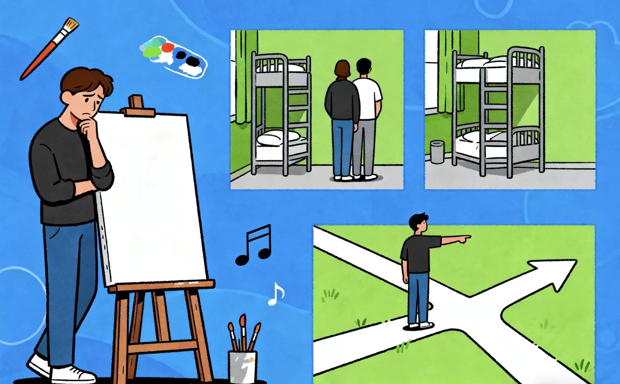 来自各地的我们同住宿舍、共事创作小组,生活习惯的差异、创作想法的分歧,偶尔会产生小摩擦;性格内向的同学面对集体活动,也可能因不敢主动表达而感到孤单,难以快速找到归属感。