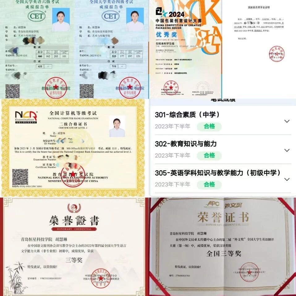 胡慧琳在学业上一路披荆斩棘,不仅顺利通过英语四六级、计算机二级考试,还荣获国家励志奖学金,是同学们眼中的学习楷模。在专业领域,她积极进取,在2024届中国包装创意设计大赛中荣获优秀奖,展现了扎实的专业功底;在中国外文局亚太传播中心主办的第二届“外文奖”全国大学生英语翻译大赛汉译英组中,斩获全国三等奖,彰显了出色的英语能力。凭借着大学期间的优异表现,她成功被南京师范大学出版专业录取,将在新媒体与数字出版领域继续深耕。