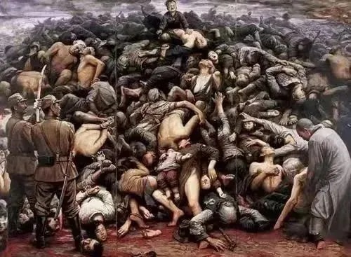 这幅画让所有观看者过目不忘,令人心痛不已。它宽3.2米、高2.1米,展现了1937年日军在南京屠城的暴行。画面主体是堆积成山的遗体,象征铁证如山,背景是滚滚不息的长江,婴儿的泣诉和滚滚的大江象征着民族的希望,悲天悯人的中华文化与日本军国主义的无情形成鲜明对比。左侧为“屠”,两个趾高气扬的日本军官站立着,其中一个正狞笑着擦拭沾满鲜血的战刀;中间一联为“生”,画面当中一个哇哇哭泣的婴儿坐在如山的尸堆上,单手撑着赤裸的死去的母亲的身体,他也是该画中唯一的幸存者;右侧一联为“佛”,一个佛家弟子正在抬起一个白发苍苍的老者的遗体。
