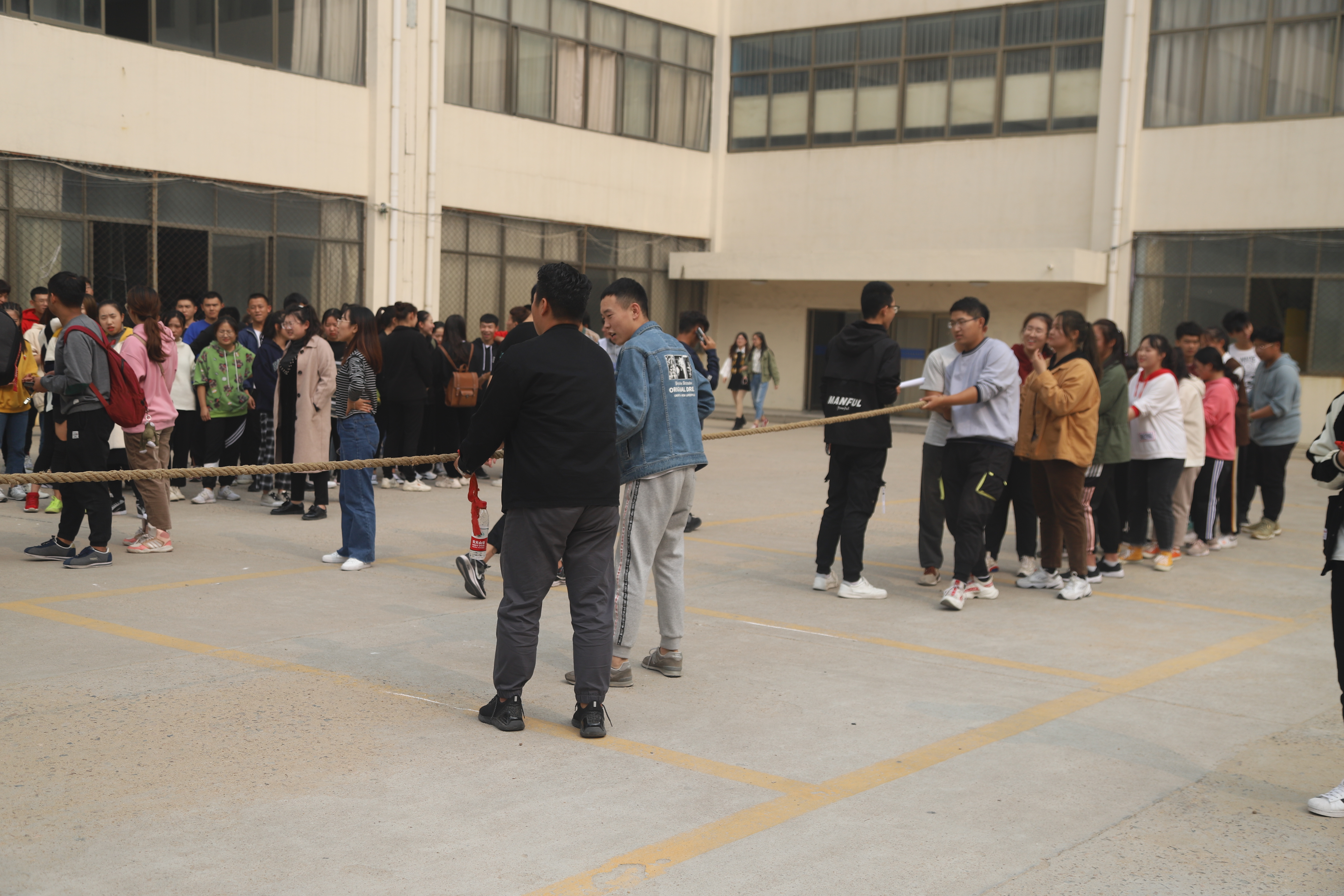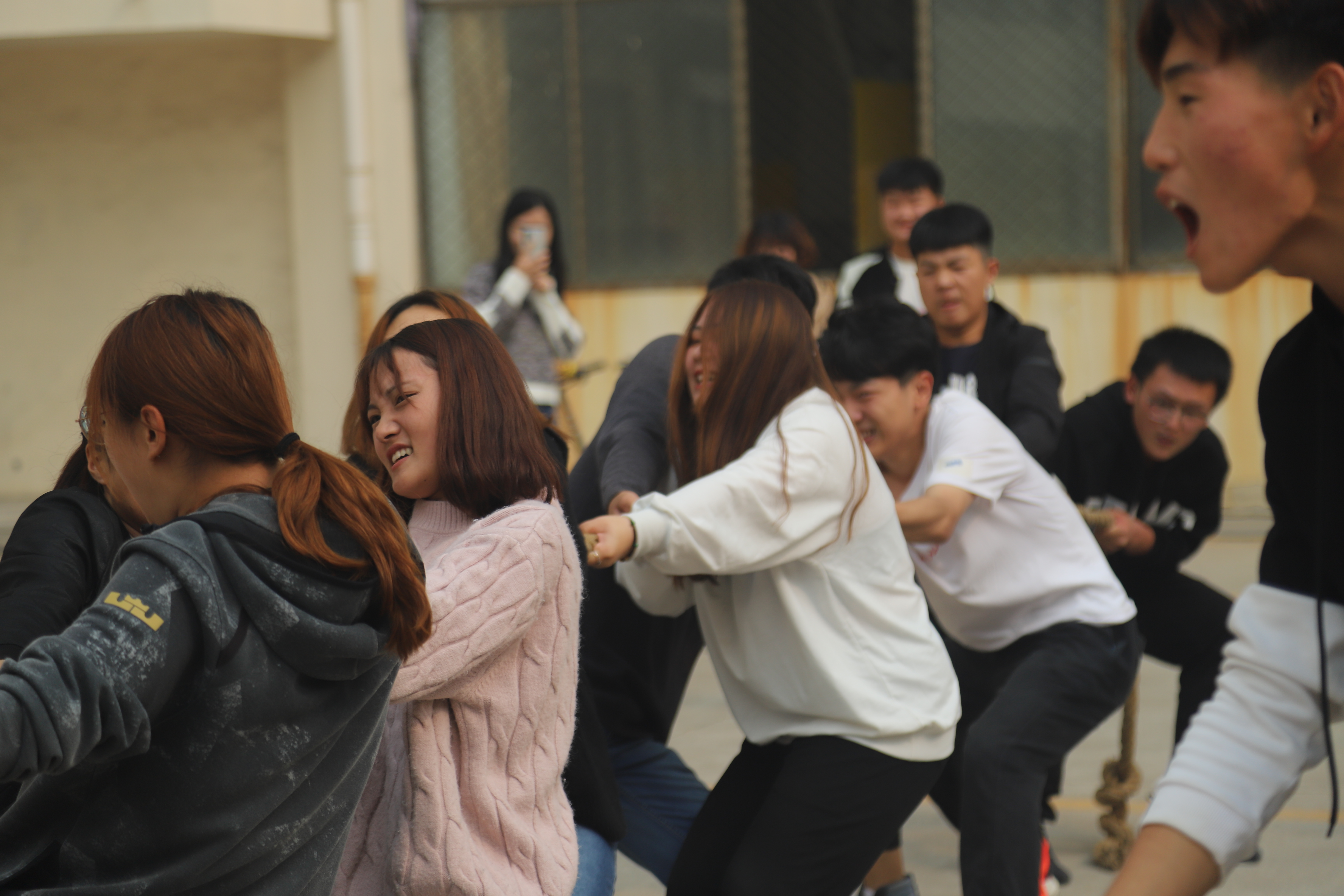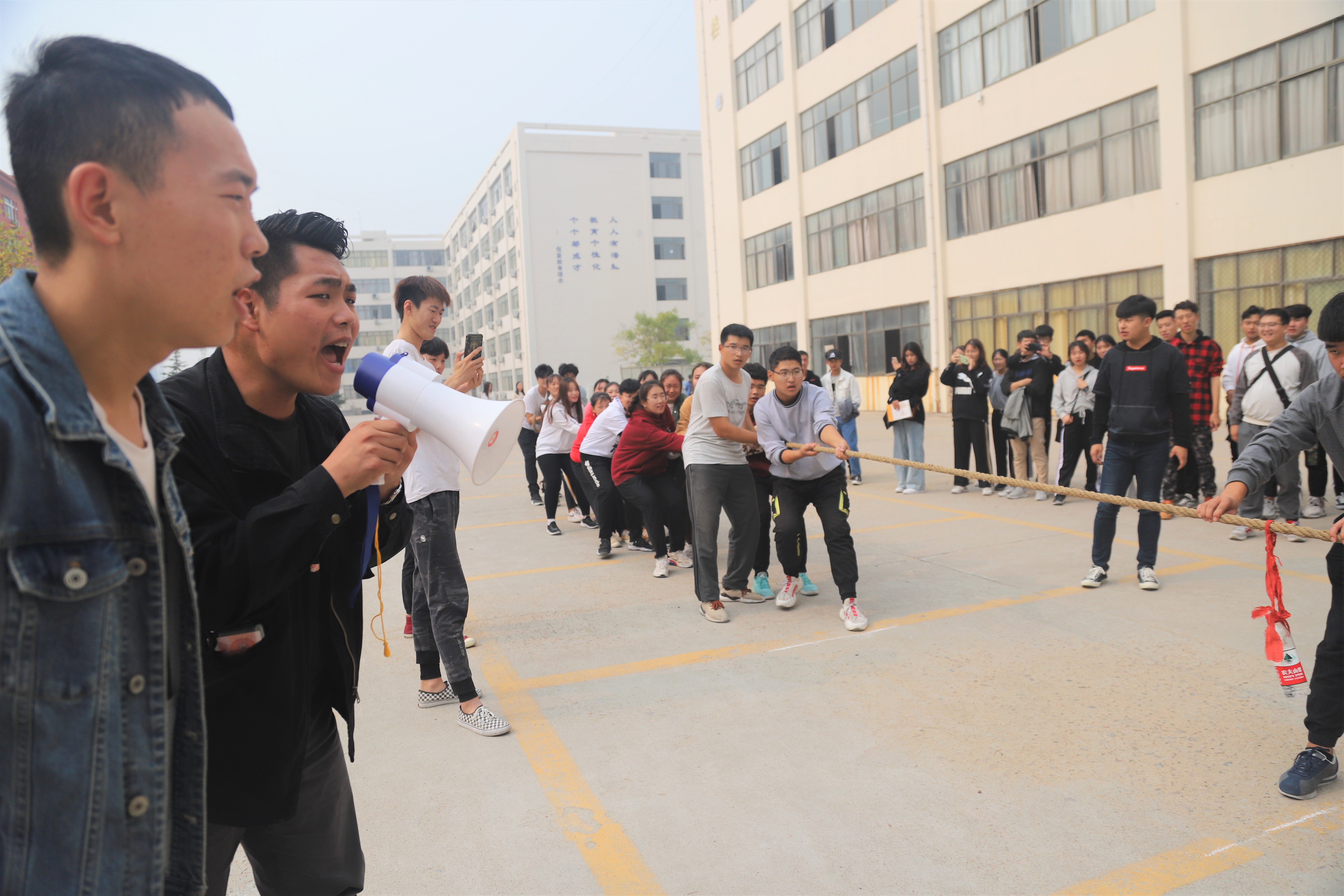 拔河比赛活动于10月21日落下帷幕,比赛实行淘汰制晋级方式,抽签决定参赛顺序,本次拔河比赛参加人数众多,赛前同学们用心踊跃报名,同时组织人员也努力做好准备工作,每场比赛都异常激烈,扣人心弦;过程高潮迭起,精彩纷呈,不仅仅男生们个个面红耳赤,青筋外露,女生们也毫不示弱,一展巾帼不让须眉之势。比赛过程中,队员们表情丰富多彩,让人忍俊不禁。场外的啦啦队成员们仿佛也身处比赛之中,热情饱满,加油呐喊声回响在整个校园,将比赛气氛推向高潮,群众的努力,众人的配合,在一阵阵呐喊与掌声中化作无穷的动力,参赛的同学斗志昂扬,纵情地投入,现场气氛热烈而高涨,助威声此起彼伏,跃动的倩影构成了一道美丽的风景线,衬出靓丽的青春。展现了同学们为班级争光添彩的决心与信心,凛冽的寒风不曾摧跨他们的意志,只会为他们呐喊助威,强大的对手不会削弱他们的信心,只会为他们加油打气,漫长的比赛不会消磨他们的勇气,只会为他们高奏凯歌。同学们发扬敢为人先、团结协作、拼搏进取的团队精神,获得了一阵阵喝彩。