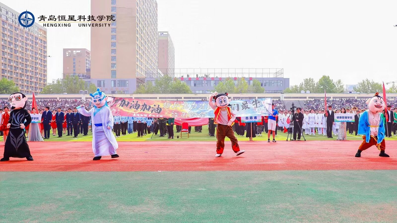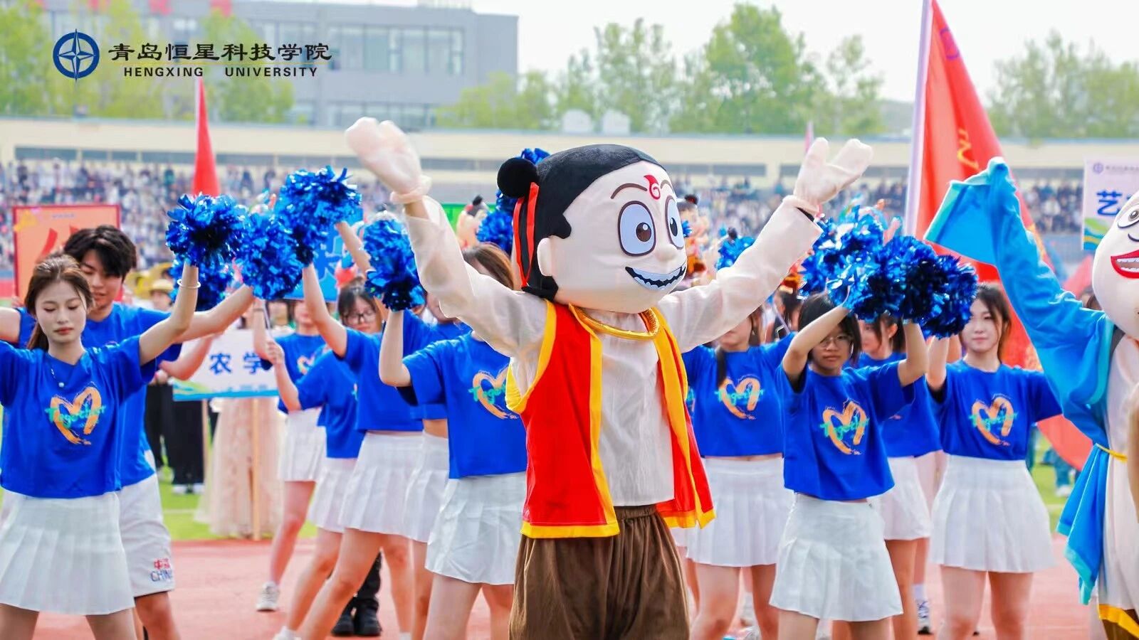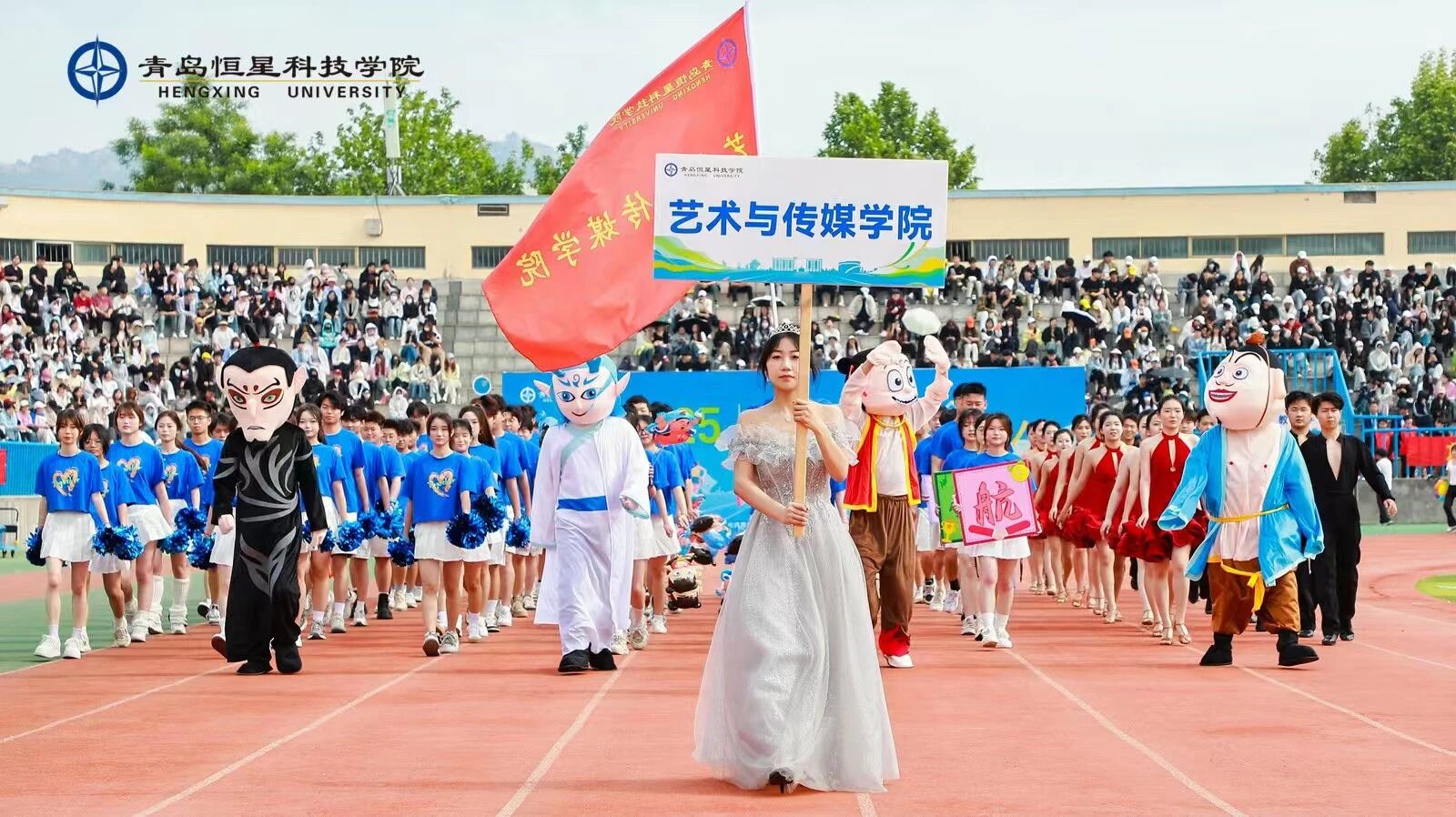 在期待中,我院方队精彩登场,举牌使者化身“移动的艺术符号”,举手投足间尽显青春风采。而其中最吸睛的,当属“哪吒系列天团”的惊喜亮相!他们可不只是简单的“走过场”,而是伴随着激昂的音乐,人偶配合方阵,上演了一场热血十足的互动秀。他们的舞蹈动作融入了各个人物的俏皮与活泼,也凸显出艺术与传媒学院学生的青春活力。