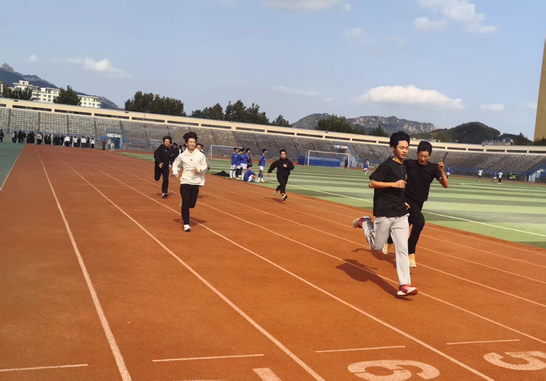 红色跑道上,选手们步伐铿锵,在蓝天白云与建筑的映衬下,每一次摆臂都透着全力奔跑的热忱。山与天作衬,选手们在跑道上你追我赶,每一步都向着终点迈进,把运动的活力绽放在这片赛场。