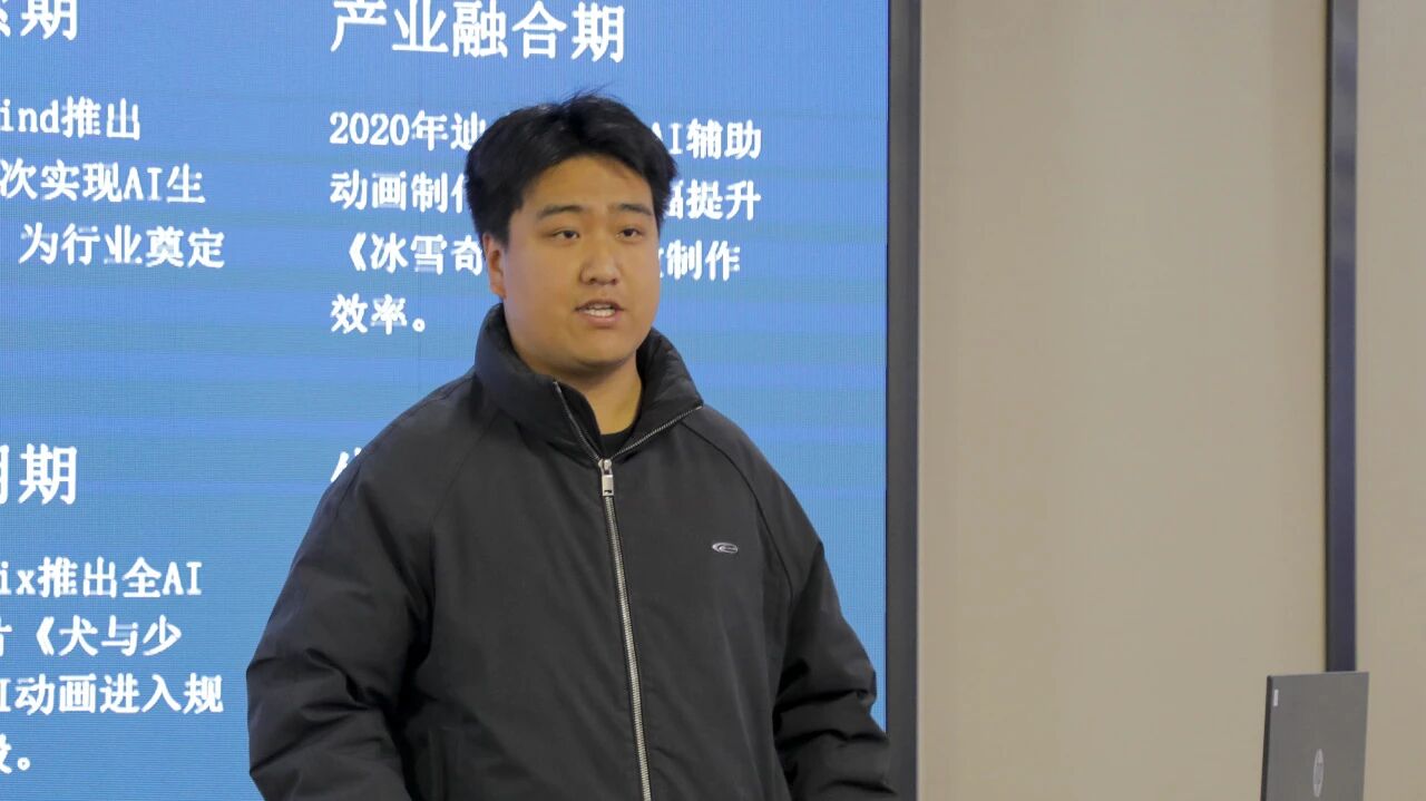 首位主讲人吴恩铭校友,以自身在AI动态漫画与二维动画领域的创业实践为切入点,展示了现代AI技术如何优化传统动画制作流程。作为青岛天青传媒有限公司的创始团队成员之一,他结合当下“AI+文化创意”的产业发展风口,分享了如何在技术变革中抓住机遇、实现创新的宝贵经验,令在场同学深受启发。