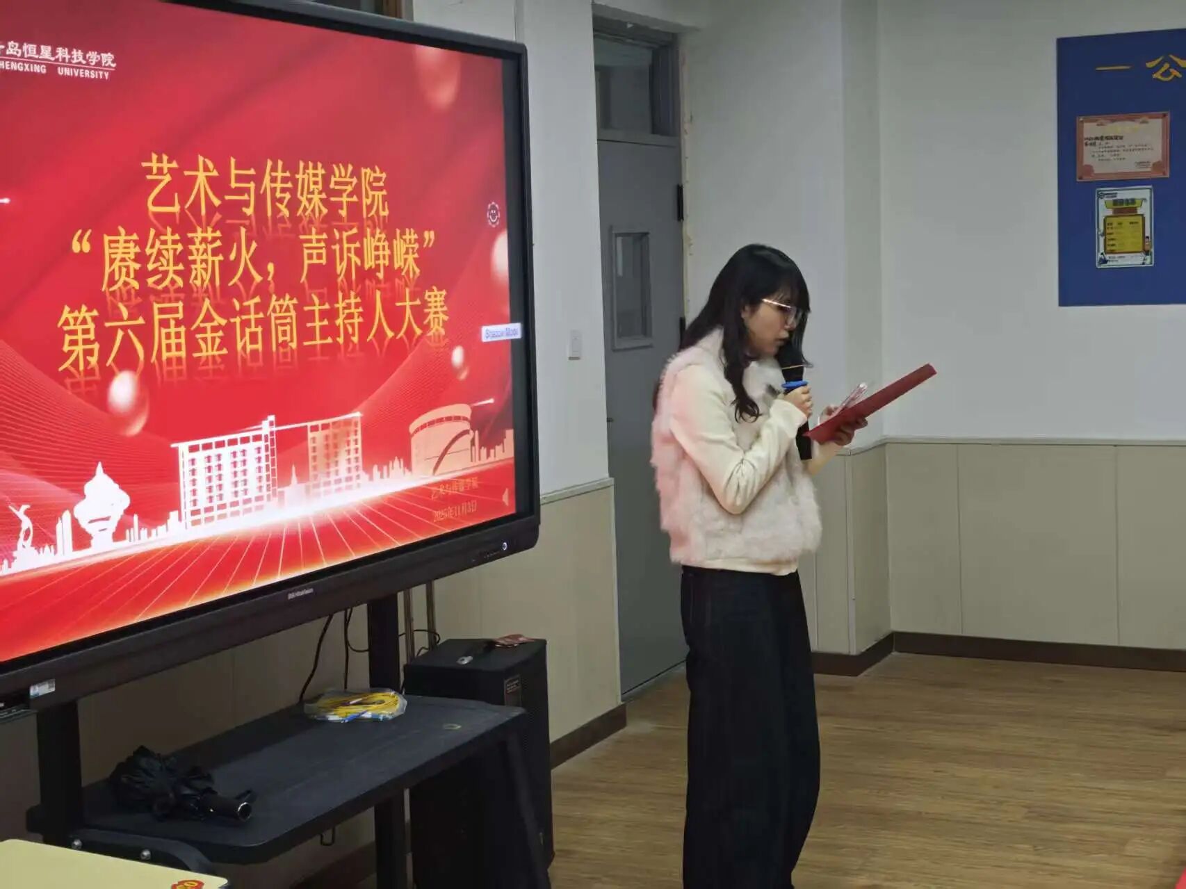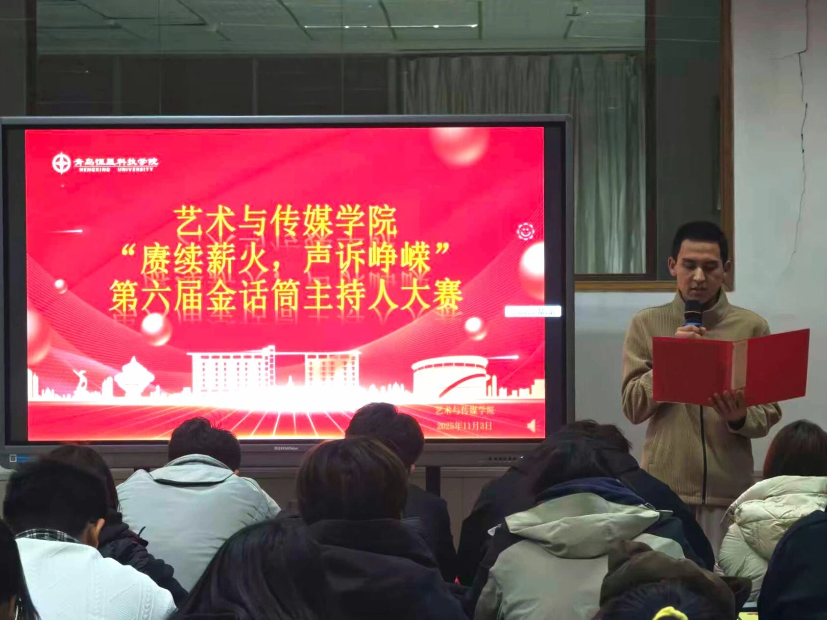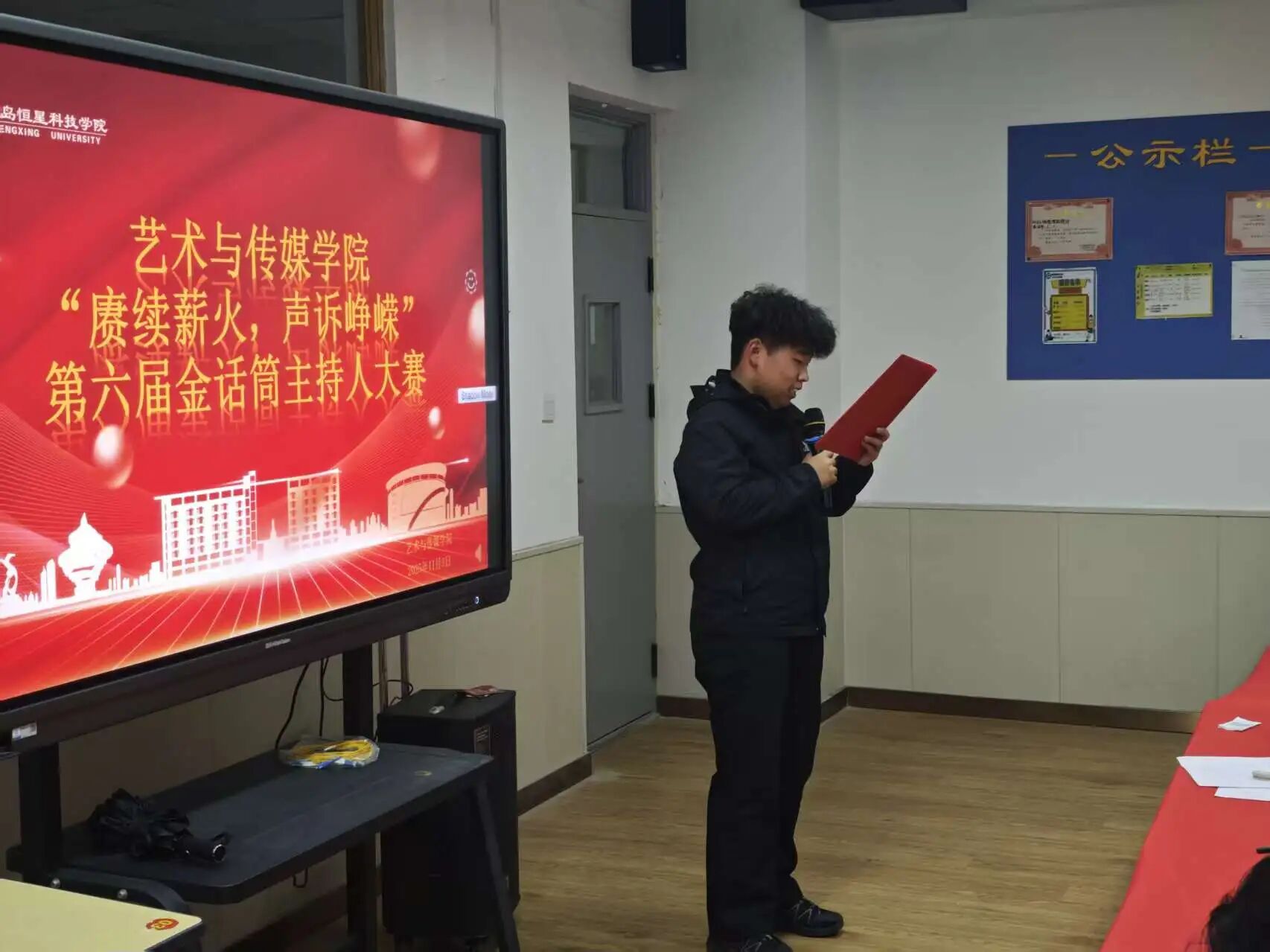 为了深入贯彻党的二十大精神,深化全民讲普通话教育,进一步增强大学生赓续薪火的精神;为了传承红色基因、弘扬时代精神,搭建青年学子展现语言魅力与理想担当的实践平台。艺术与传媒学院于2025年11月3日19:00在A3-206举办“赓续薪火,声诉峥嵘”第六届金话筒主持人大赛。