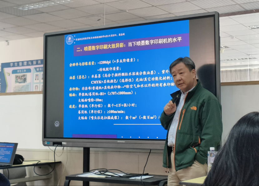 在讲座中,蒲嘉陵教授探讨了印刷技术的演变历程、国际印刷展览的概况,以及中国印刷行业的发展现状。他着重介绍了数字印刷技术在现代印刷领域中的关键作用,并介绍了多款常用的喷墨印刷技术及其功能。此外,蒲教授讲解了喷墨数字印刷与喷墨成像技术,并探讨如何通过这些技术提升印刷效率,激发创意潜能。