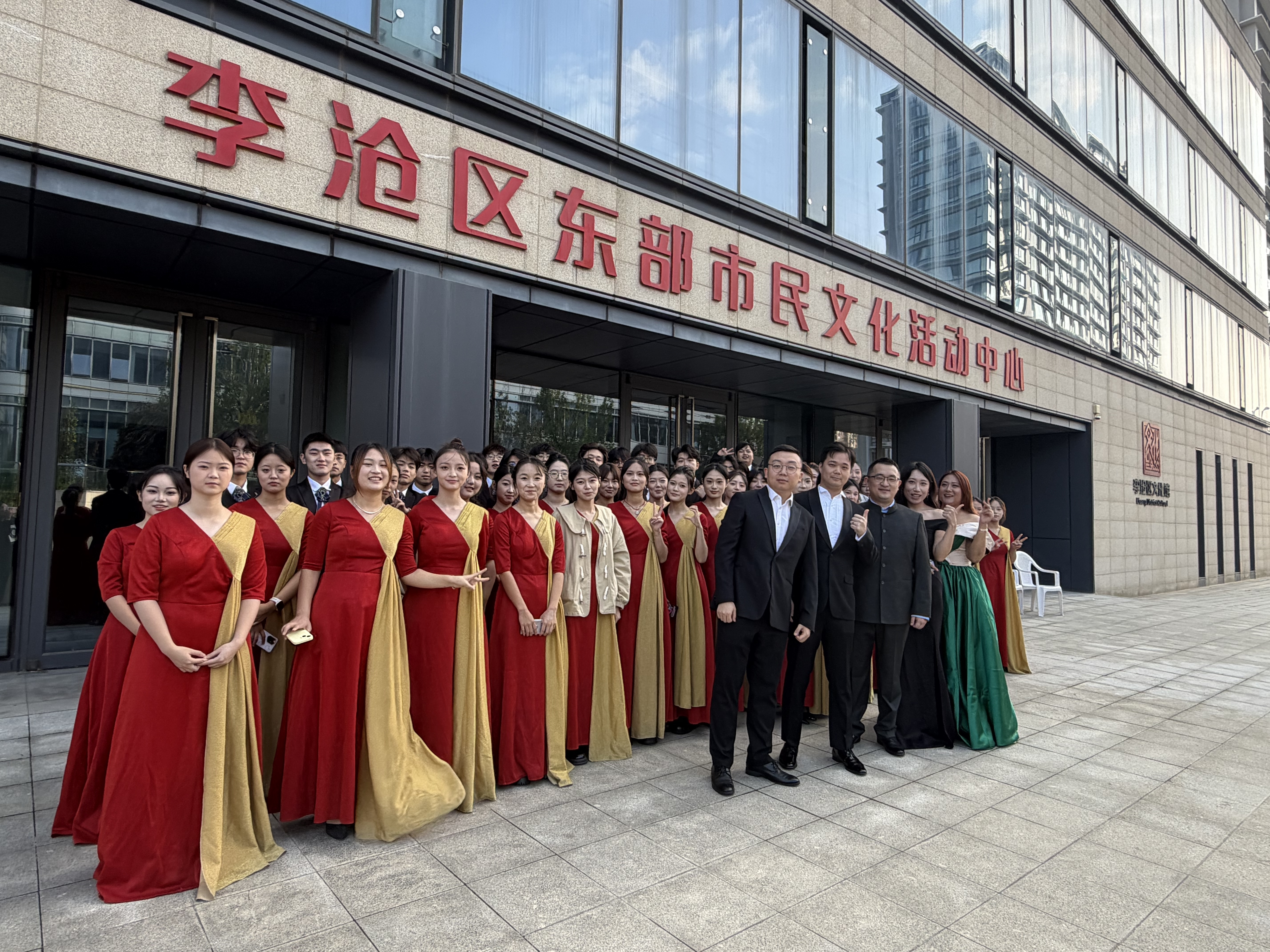 我院李鹏飞老师作为合唱团的指挥,以精准的节奏把控和艺术感染力,引领团队呈现完美和声;伴奏刘煜桐老师以灵动的琴声为合唱织就动人底色;陈文杰、戴志明、娄新雨、李照欣四位领唱教师,更是用富有张力的嗓音,为曲目赋予灵魂。由王晨老师带领的合唱团的学生们更是朝气蓬勃,与教师们的专业积淀碰撞融合,让合唱既有传承的温度,又有创新的活力。
