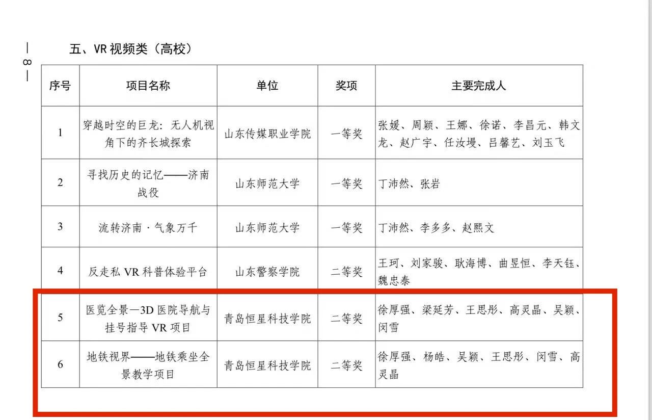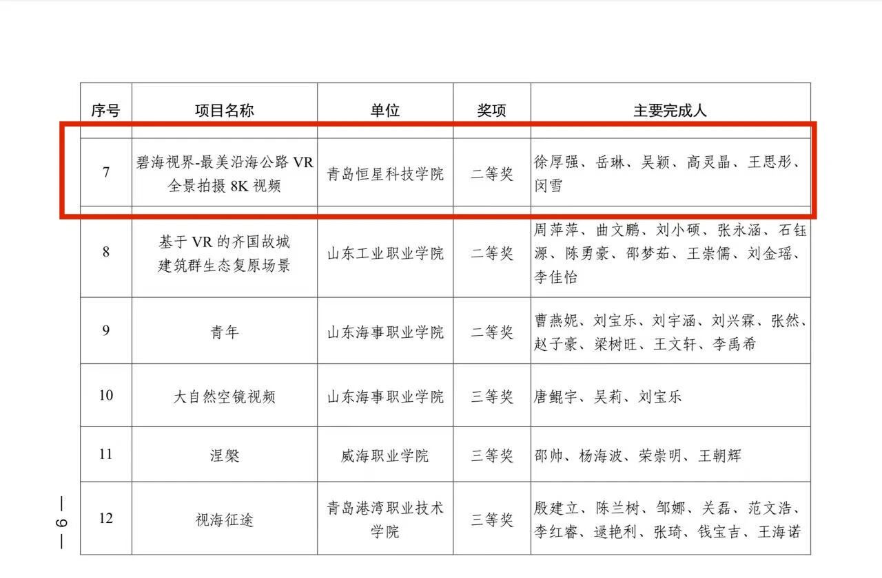 近日,由山东省广播电视局、山东省教育厅、山东省科学技术厅、山东省工业和信息厅联合举办的山东省高新视频创新大赛正式公布获奖名单,青岛恒星科技学院获评“优秀组织奖”。我院师生在本次大赛中表现优异,由徐厚强老师指导的3项作品均荣获VR视频类(高校)赛道二等奖,并受邀赴山东广播电视台参加颁奖典礼。