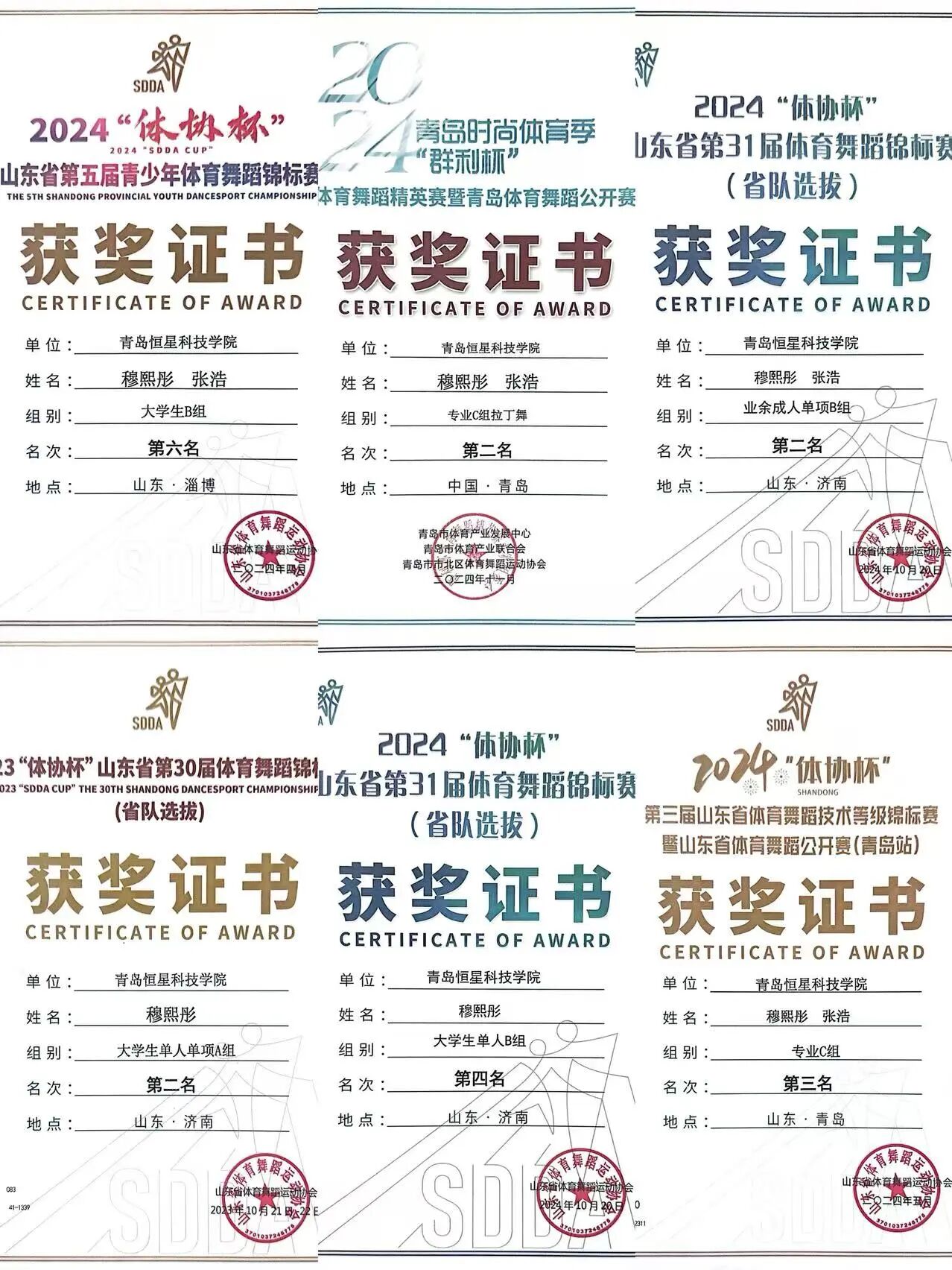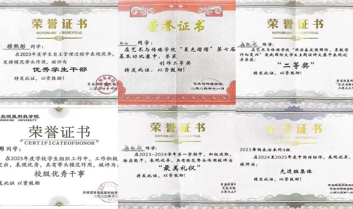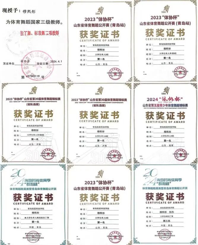 在校期间,穆熙彤始终保持着积极的学习态度,有着明确的学习目标。除了认真学习老师传授的知识以外,她还积极参加省级类的专业比赛,不断挑战自己,使自己的专业技能更上一层楼。荣获2023年“体协杯”山东省第30届体育舞蹈锦标赛(省队选拔)大学生单人B组第一名、2023“体协杯”山东省体育舞蹈公开赛(青岛站)大学生单人B组第一名、2024年“体协杯”山东省第5届青少年体育舞蹈锦标赛大学生单人B组第一名、2024青岛时尚体育季“群利杯”体育舞蹈精英赛暨青岛体育舞蹈公开赛大学生单人精英组拉丁舞第一名等共计14项的省级优秀成绩。
