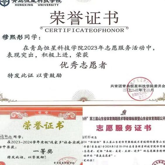 在学习之余,她积极参加志愿服务活动,参加2023年寒假“返家乡”社会实践活动,探望社区孤寡老人,为她们献上礼品和祝福,并获得2023年“返家乡”社会实践一等奖。2024年暑假参加“三下乡”社会实践活动,前往红色纪念馆,了解红色历史,传承红色精神。同时在2023年志愿服务活动中表现突出,积极上进,荣获“优秀志愿者”荣誉称号。在2024“体协杯”第三届山东省体育舞蹈技术等级锦标赛暨山东省体育舞蹈公开赛(青岛站)参加志愿服务工作,发扬“奉献、友爱、互助、进步”的志愿服务精神,表现优异,被评为“最美志愿者”。