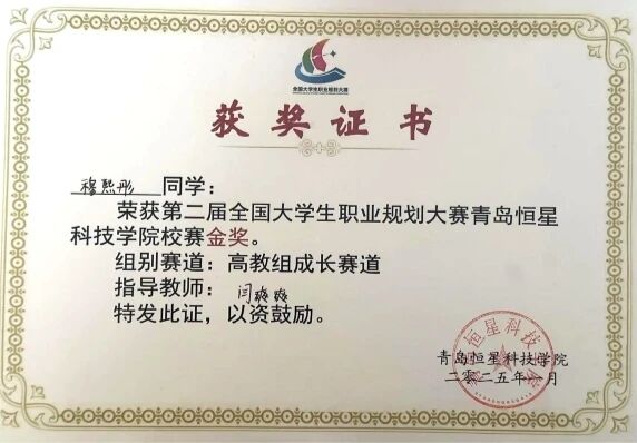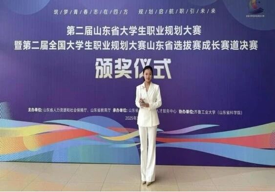 她还积极参加大学生职业生涯规划大赛,展示学校教育成果,坚定自己的职业愿景,明确职业方向,并在荣获校级金奖和第二届山东省大学生职业规划大赛铜奖的优秀成绩。