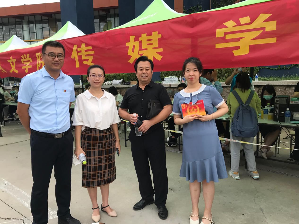 艺术与传媒学院院长曲洪启,副院长李林、庞学峰与新生合影