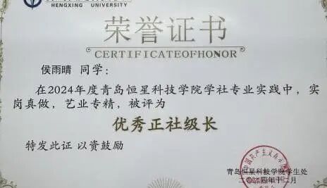 在学社实践中,她担任社长时展现卓越领导力,荣获 “优秀社长” 证书。此外,她满足于此,课余钻研平面设计,经培训与实践,成功考取平面设计师职业能力证书,为学社成员树立全面发展的榜样 。
