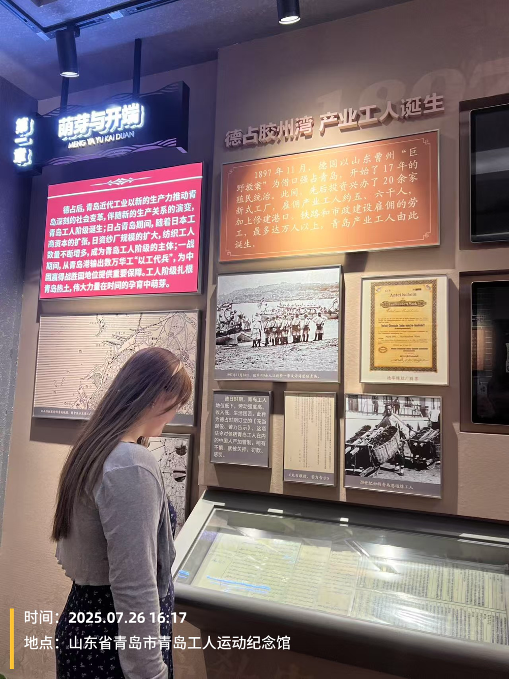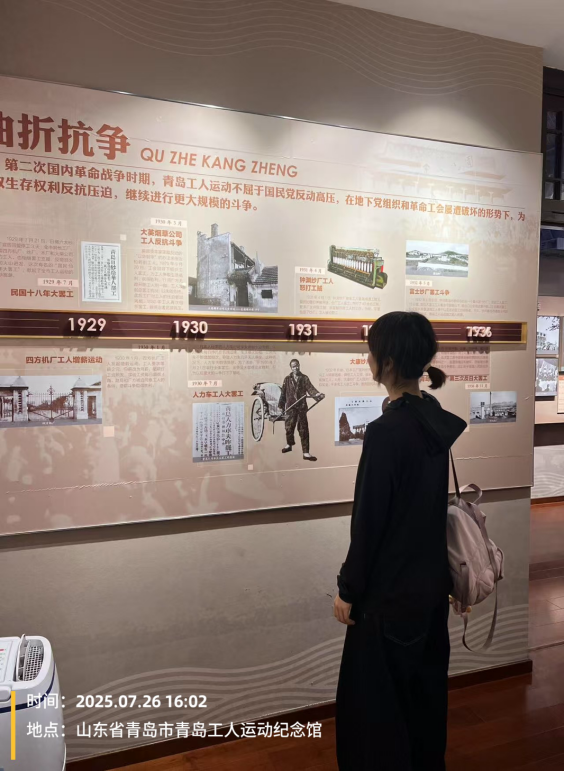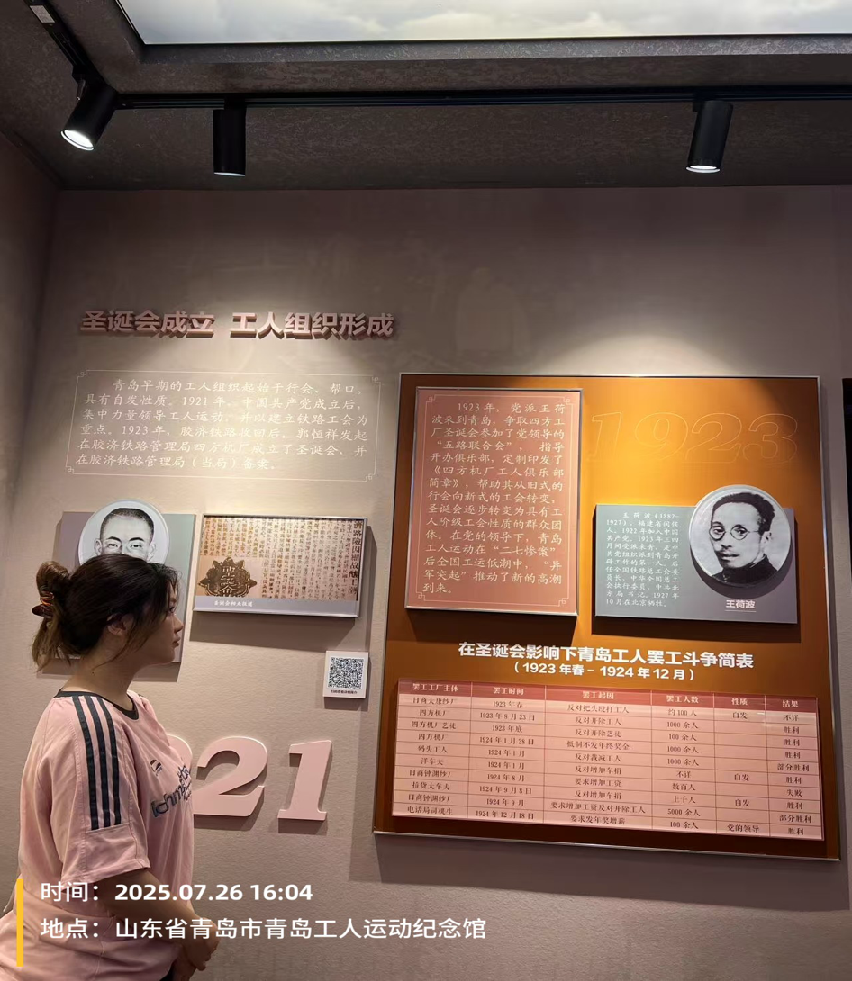 实践团来到了位于市南区大沽路的青岛工人文化运动纪念馆,它是一座具有重要历史意义的红色教育基地,宛如一座承载着工人阶级奋斗记忆的丰碑,矗立在城市的一角。它不仅是历史的见证者,更是工人阶级抗争精神的传承者。馆内丰富的藏品、详实的史料以及精心设计的展陈,全方位、多层次地展现了工人运动从星星之火到燎原之势的艰难而辉煌的历程。