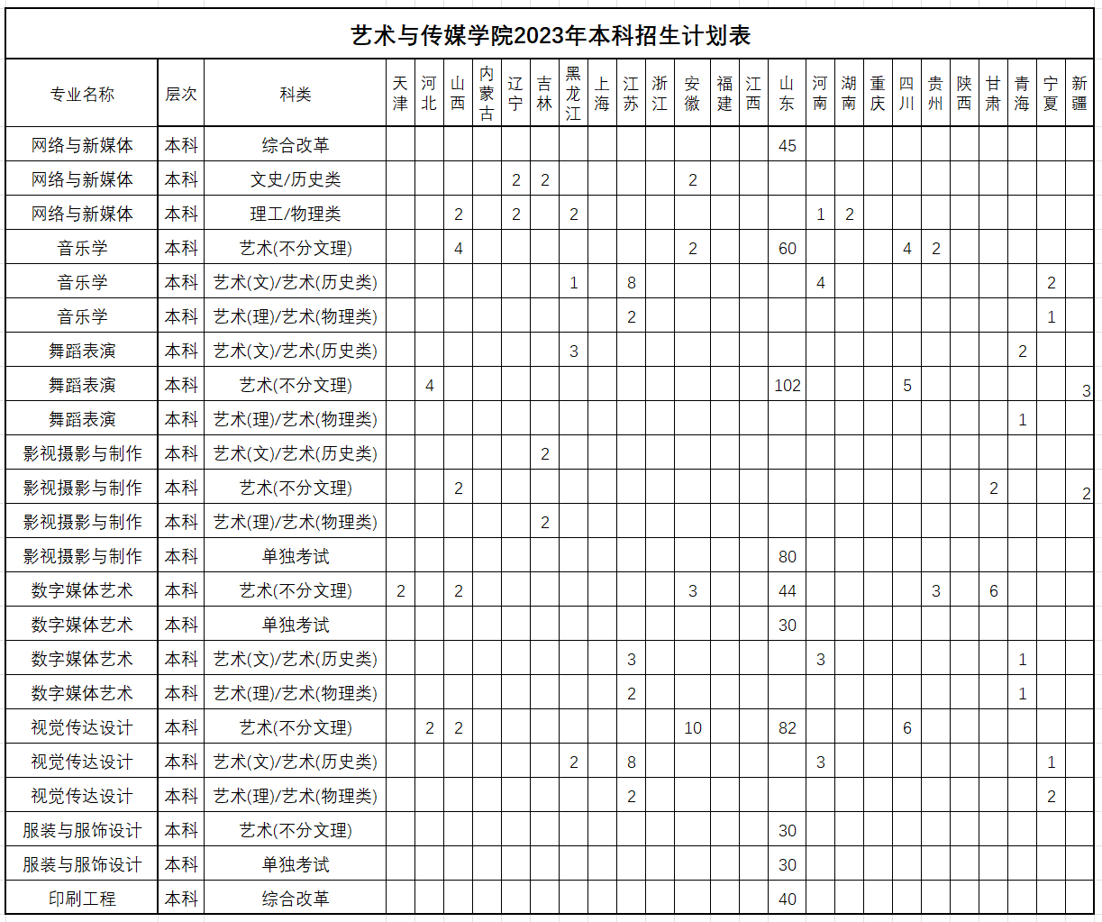 艺术与传媒学院现在有8个本科专业和3个专科专业,学生总数2139人。其中全日制本科在校生1833人,全日制专科在校生306人。艺术与传媒学院目前有8个本科专业,包括:舞蹈表演、服装与服饰设计、数字媒体艺术、影视摄影与制作、印刷工程、音乐学和视觉传达设计、网络与新媒体;3个专科专业包括:舞蹈表演、广告艺术设计、包装策划与设计。其中,印刷工程专业于2015年被评为“山东省优势特色专业”。